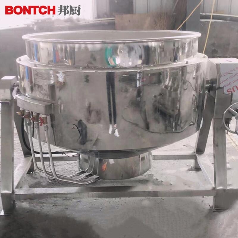 豆浆熬煮夹层锅 酱牛肉卤煮设备可倾的夹层锅一般是底部结构为支架,有一手轮,可以调节锅体的旋转角度,为90度。而一般可倾的夹层锅容量为600L,建议是不要*过600L,因为锅体容量过大,再加上锅体本身的重量,容易造成倾倒过程中出现一些安全隐患,不利于厂家生产安全。