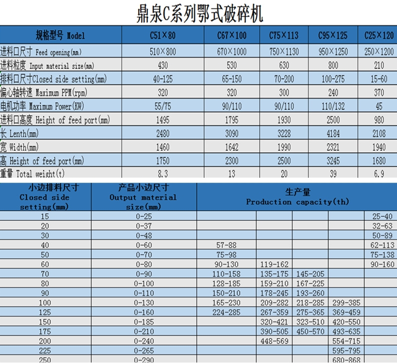 鄂式破碎机:鄂式破碎机分为粗破和细破,颚式破碎机俗称鄂破,又名老虎口,由动鄂和静鄂两块鄂板组成破碎腔,模拟动物的两鄂运动而完成物料破碎作业的破碎机。鄂式破碎机破碎方式为曲动挤压型,电动机驱动皮带和皮带轮,通过偏心轴使动鄂上下运动,当动鄂上升时肘板和动鄂间夹角变大,从而推动动鄂板向定鄂板接近,与此同时物料被挤压、搓、碾等多重破碎;当动鄂下行时,肘板和动鄂间夹角变小,动鄂板在拉杆、弹簧的作用下离开定鄂板,此时已破碎物料从鄂破破碎腔下口排出,随着电动机连续转动破碎机动鄂作周期性的压碎和排料,实现鄂破批量。
