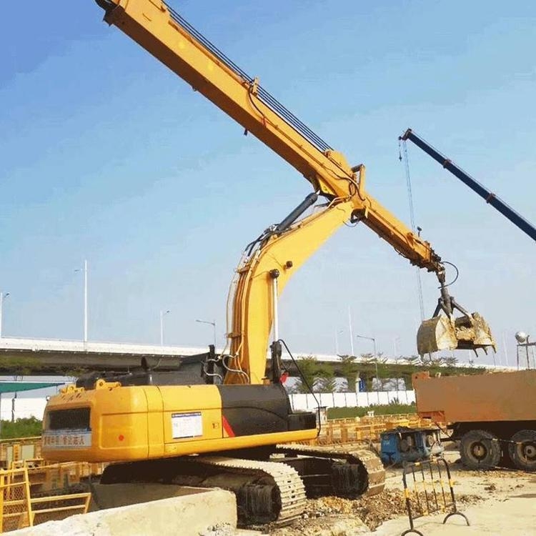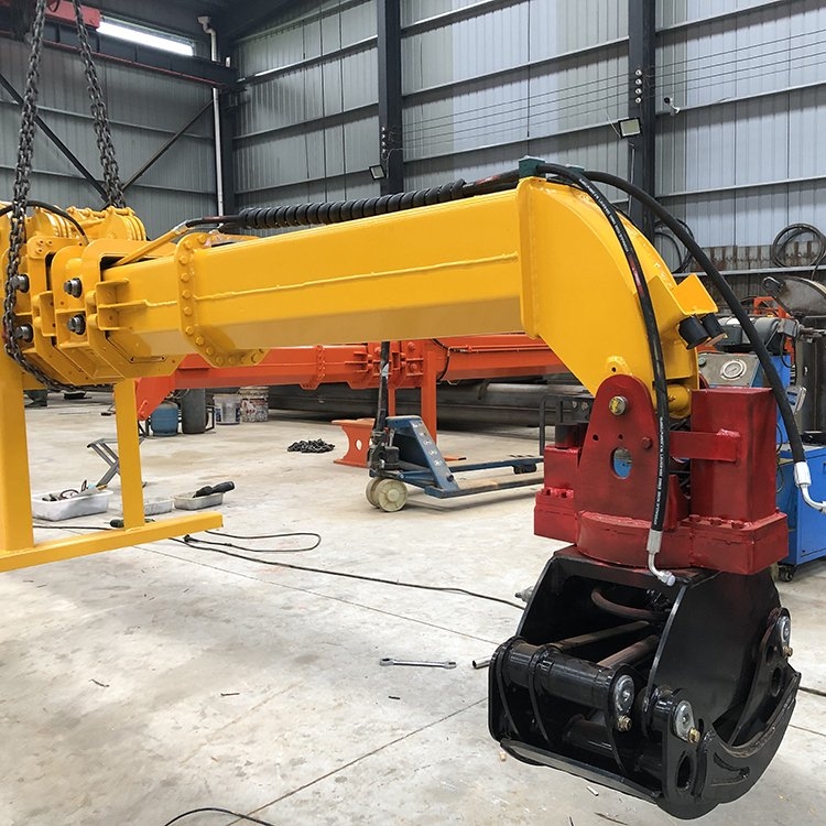 它是将挖机原有的小臂拆下来,吧连接支架焊接好,直接套斗轴上使用。由于它另一端部分是悬空外置的,保证了设备的平衡,