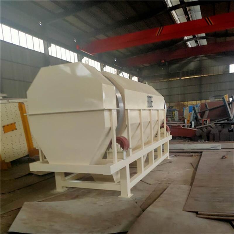 仿照人工利用斜面筛网筛砂的工作原理,采用平置滚筛筒,并保证料流在筛筒中的多圈内螺旋叶片间可连续滚筛五圈以上,从而使砂料反复翻滚、滑动而充分离散、分离;不同于斜置滚筛引起的大小料相互推挤、埋压,筛分过程匆忙;也不同于斜置振动筛的大小料振跳、混料。整个设备由原料储料斗、原料供料皮带机、平置筛网、成品砂堆料皮带、弃石出料槽等组成,设备通电运转后由装载机将原料装入大容量储料斗,原料经由供料皮带投入到平置筛筒,旋转的筛筒带动原料在筒内叶片的推挤、翻滚下形成原料在筛网面滑滚的人工筛砂效果,筛出的成品砂通过集料斗落在成品砂皮带上,同时被皮带提升落下呈成品料堆、或直接落入储料斗,整个过程连续且物料分级清楚、准确。