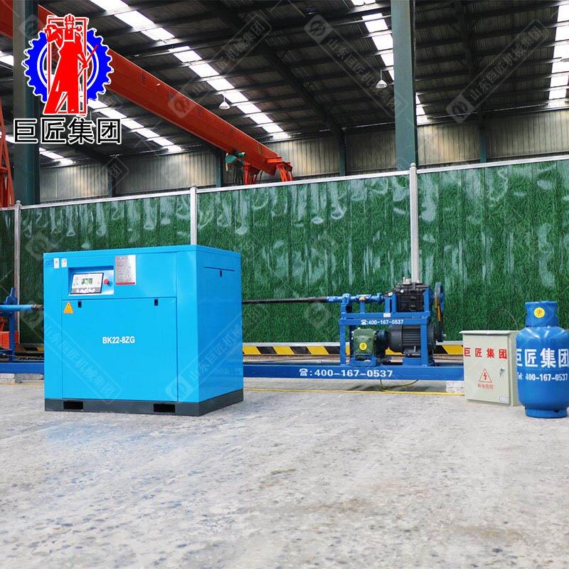在我国山区尤其是南部省份山区山体中存在着一定面积的滞水带,为满足山区群众用水需求,山东巨匠机械集团与济宁巨匠机械研究院联合研发了一款山体横向钻机。该横向钻机采用模块化设计,由主机、滑道、配电盘、水气瓶等部分组成,布局合理,结构紧凑。为进一步便于移动搬运,主机可继续拆解为回转部、推进部、主机底座,滑道可继续拆解为导轨、钢丝绳张紧器、钻具支撑架。钻机主机采用气动钻进、湿式排渣的水气结合工作原理,与长行程滑道配合使用,可实现山体横向打孔钻井。该钻机现已广泛应用于横向钻井和山体横向钻孔等作业场合。