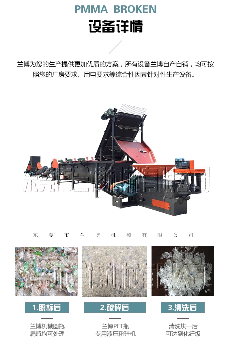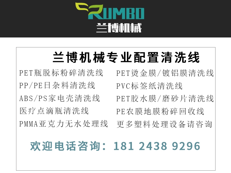 东莞市兰博机械有限公司专注于塑胶制品的回收与清洗,为实现废旧塑料资源再生化,自兰博成立便致力于研发和生产各类废塑料再生处理设备,我们的产品配置线涵盖了PMMA亚克力板材无水破碎生产线、HDPE/PP低压浮水硬料回收处理生产线、PET卷材烫金镀铝膜水粉回收清洗线、ABS/PS家电外壳回收处理生产线、LDPE薄膜/PP袋回收清洗生产线、PET 聚脂瓶脱标水粉回收处理生产线、PS/PVC管材、片材回收处理生产线及各类软膜卷材料处理生产线。公司专注于废旧塑料回收市场的动向及行情,对废旧塑料的品类针对性的配置研发各类塑料的清洗流程,更多塑料回收方案请联系兰博机械,我们将为您提供针对性的解决方案,为您的回收与生产提供更专业的技术支持!