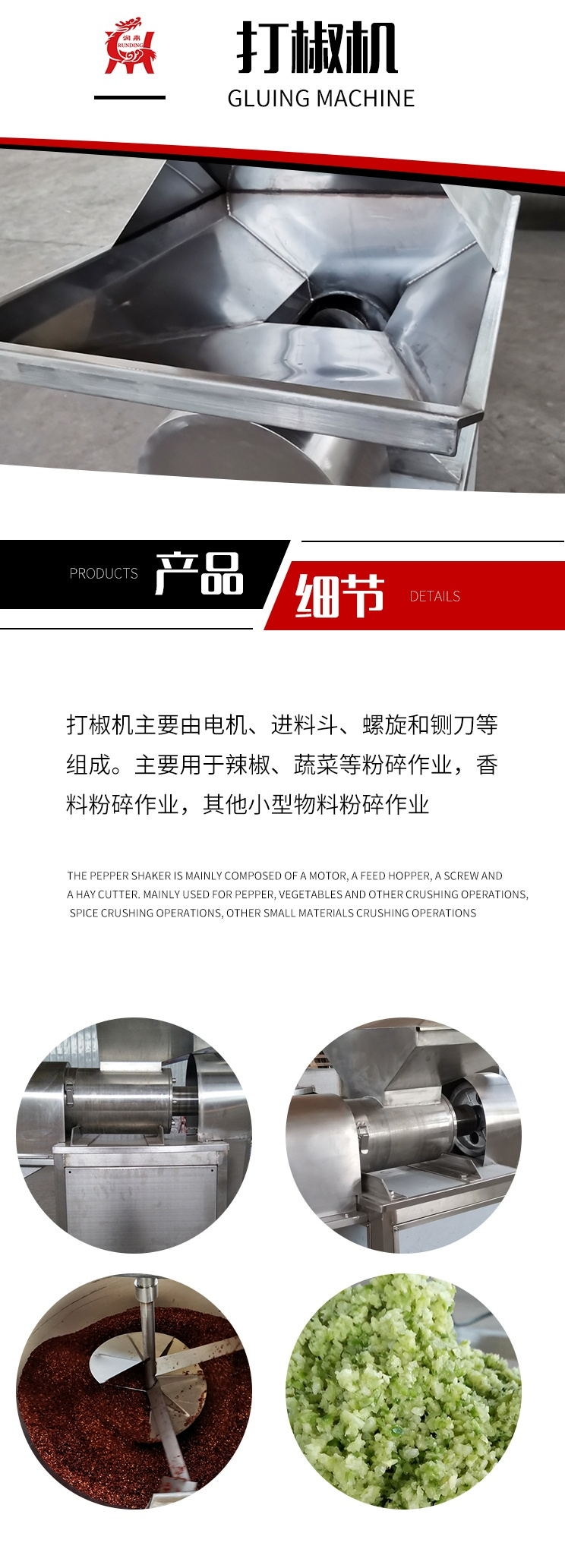 辣椒粉碎机我们又称为打椒机、辣椒破碎机,主要进料斗、电动机、内螺旋、铡刀、出口筛片以及电动推进器组成。是辣椒酱、豆瓣酱等调味食品成套生产线中不可缺少的加工设备。辣椒粉碎机其切椒刀片采用耐磨钢材保证了设备的耐用性和高效性,其材质采用304不锈钢制作,出料筛大小可根据用户要求定做。