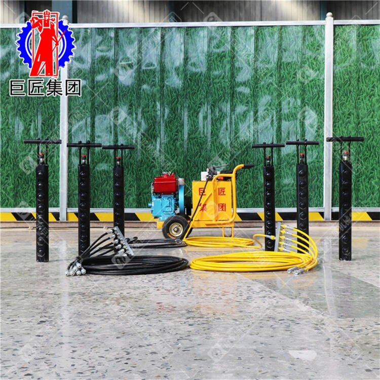 山东巨匠机械集团静爆液压劈裂设备是由液压泵站、分流器、高压油管和劈裂棒组成。该设备现已广泛使用于露天采石、巷道掘进、混凝土破拆以及狭窄场地的拆除作业等领域。根据液压泵站动力的不同,该静爆液压劈裂设备可分为柴油站款和电机站款。液压泵站往外泵油时,液压劈裂棒的柱塞顶出,岩石由里往外受力,破坏岩石内部结构,达到岩石分裂的目的。