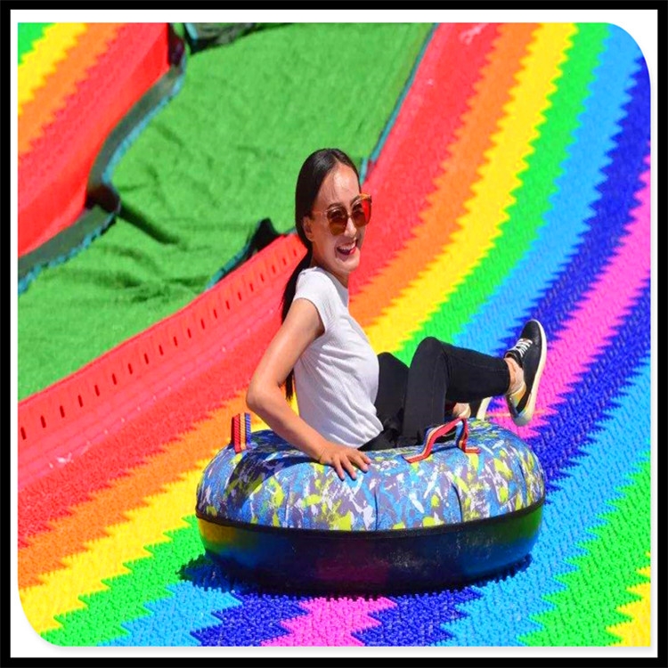 七彩滑道长度是可以定制的,长度达到100至150米,还有长达260米的。这么一条长长的七彩滑道铺在那里,何等的壮观宏伟,远远的就可以吸引住人们。而且七彩滑道玩法惊险,让游客们在游玩的过程中体验到旋转感、倒滑感、失控感、碰撞感等。