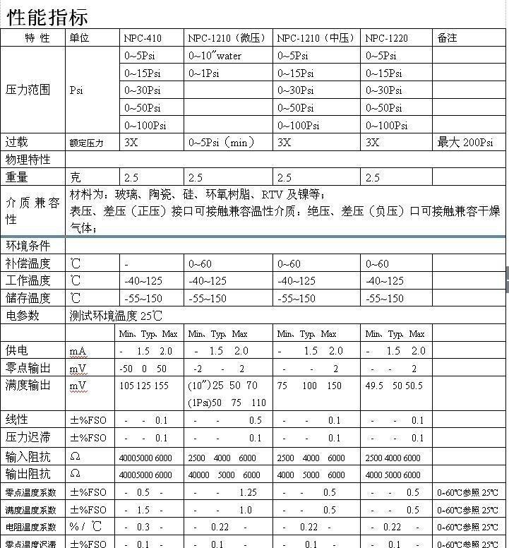 正如Nova Sensor公司的所有硅压力传感器一样,NPC系列应用于了Senstable压阻传感技术,硅敏感元件采用了先进的离子注入工艺,由上述工艺所形成的高质量惠斯登电桥电路和精密的力学结构,实现了力电一体化转换。