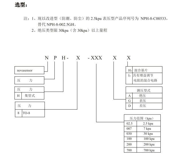 · Novasensor 公司的NPH系列,将集成化的敏感芯片封装于标准的TO-8型电子外壳内,便于安装到印制线路板上,是具有良好性价比的产品。