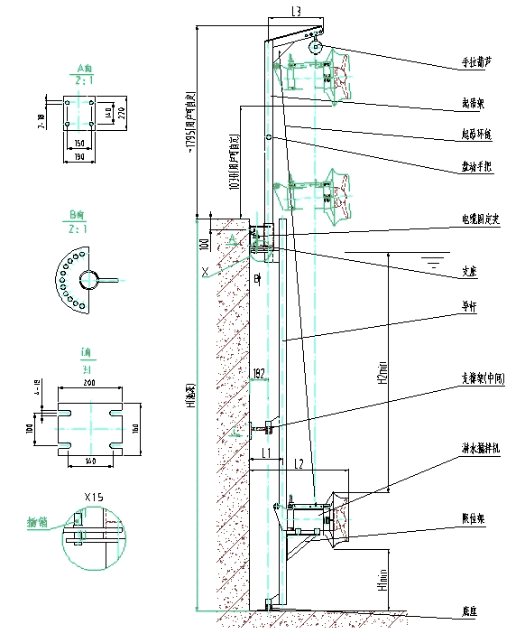 4、当H>5m,应在安装系统II、III导杆中间添加一支撑架。