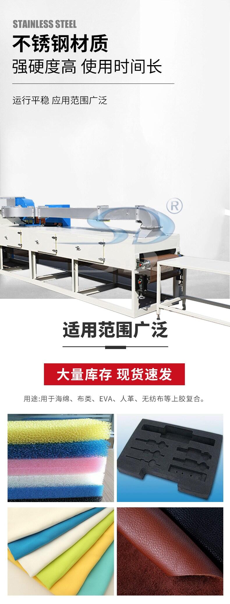 本机适用于在木板涂上胶水,再与保护膜或防粘纸复合。也可适用于海绵、布、革等的涂饰和复合。适用于建筑墙体保温、地板隔音、内墙板装修装饰等各种行业。