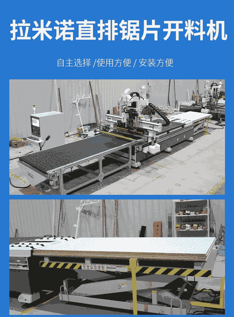 直排加工中心主要用于板式家具柜体以及门板的加工生产;可以钻孔、开槽与切割下料的加工,像市面上常见的板式家具二合一、三合一连接件,隐形连接件的板式家具都可以加工。而且还可以实现雕刻门板,是一款多功能的能够多样化加工的数控开料机机型。