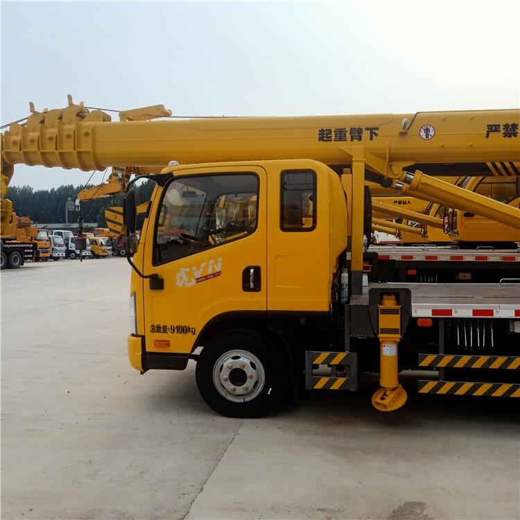 潍柴130马力发动机,总质量9.1吨,外形尺9190*2110*3140mm,750R16钢丝轮胎,轴距3300,300矩形管,5条活动支腿,1.2米内回转支撑,小行星减速机,双卷扬(8t+5t)单泵液压系统,6米6节外走绳,电子油门,11KW电机,前车空调