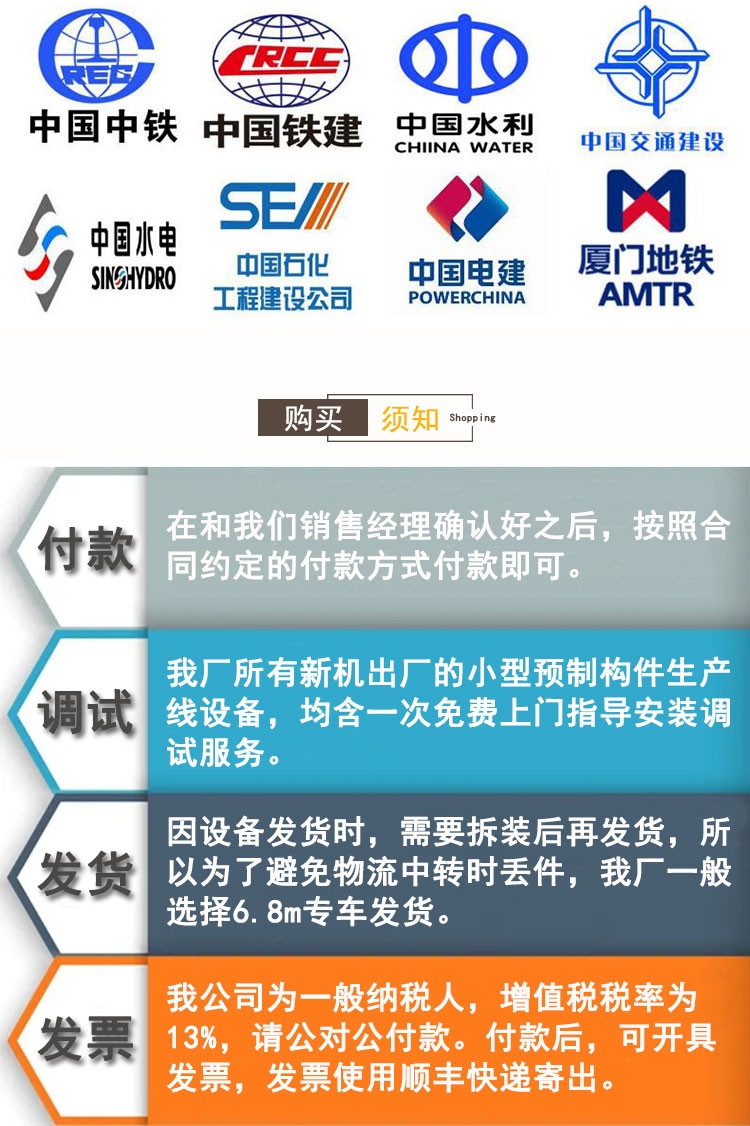 混凝土拌和区包括集料仓、混凝土拌和楼,集料仓包括水泥料仓、多个配料仓,配料仓底部设有卸料门,混凝土拌和楼包括水泥储罐、粉煤灰储罐、外加剂储罐、水池、拌和系统、计量系统、运输系统,拌和系统包括拌和机、混合料斗、搅拌车;小型预制构件生产线 沟盖板预制生产线 全自动预制件生产机器