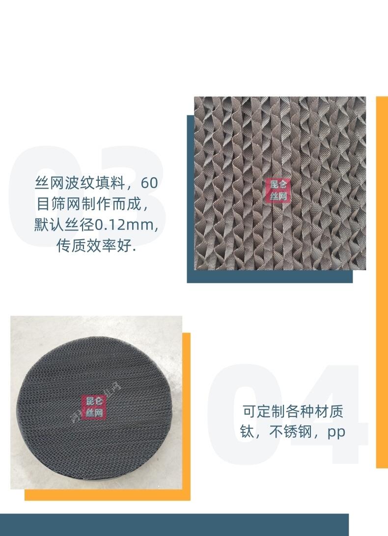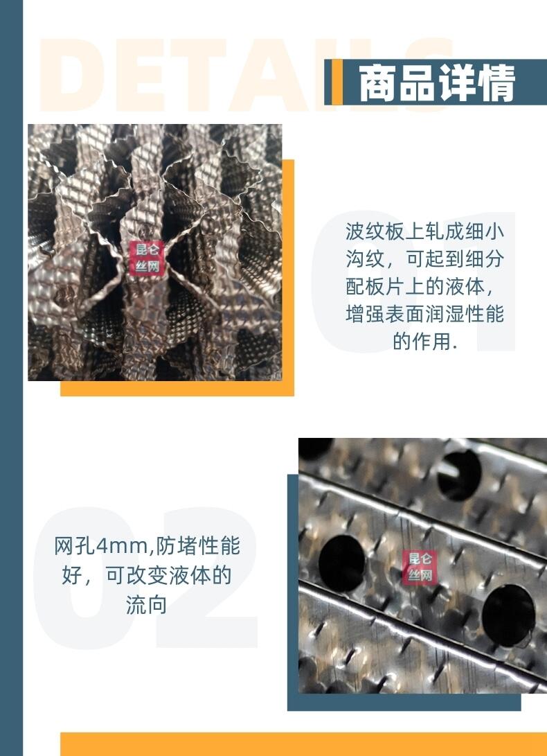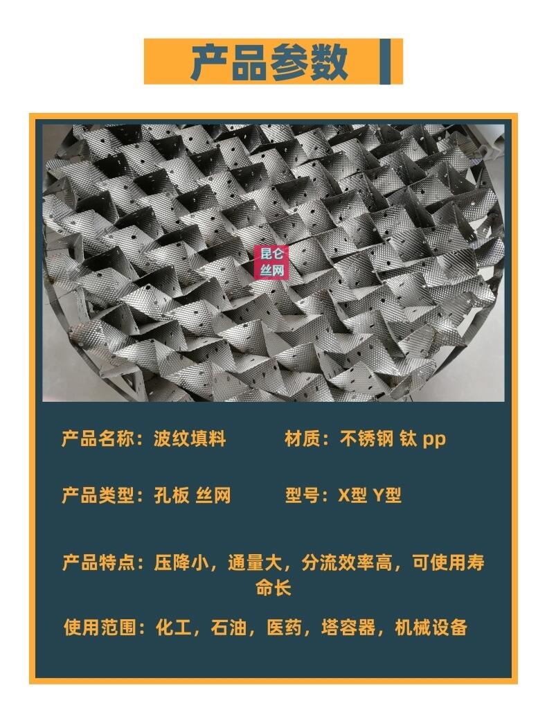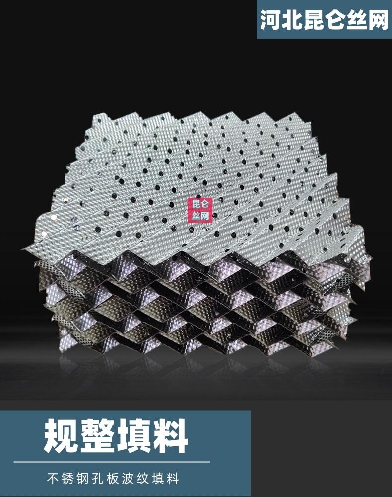 孔板波纹填料是在金属薄板表面冲孔、轧制小纹、最后组装而成的规整填料,具有阻力小、气液分布均匀、效益高、通量大、放大效应不明显等特点,应用于负压、常压和加压操作。
