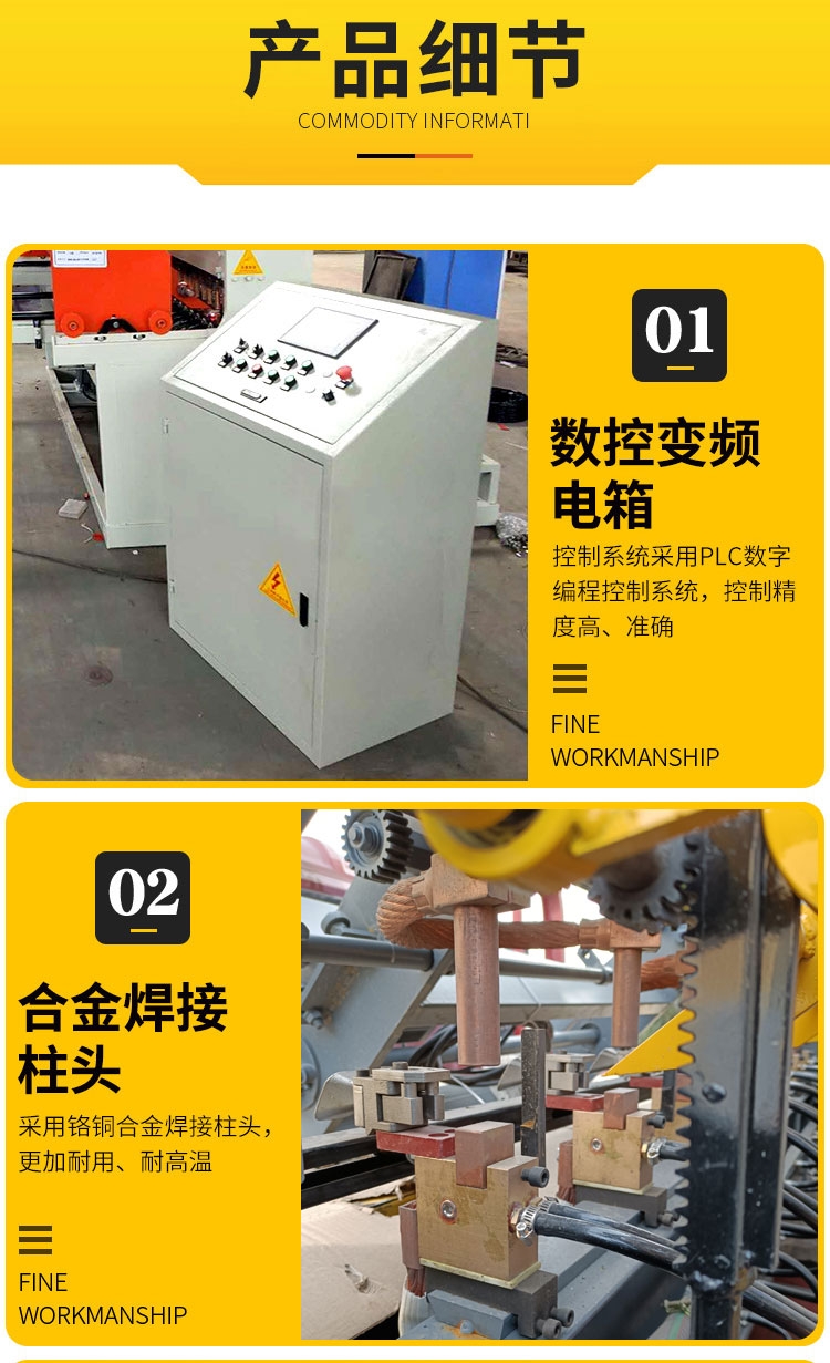 豫龙钢筋网排焊机 钢筋网片焊机 数控钢筋焊网机 该设备机械结构合理,操作简单,,性能可靠,所焊网片平整、网孔均匀、、无烧痕,对角线误差小,纬丝和径丝均为盘丝,径丝自动调直,纬丝自动调直.且采用的定位装置,保证所含网片无需裁边,且边缘整齐。