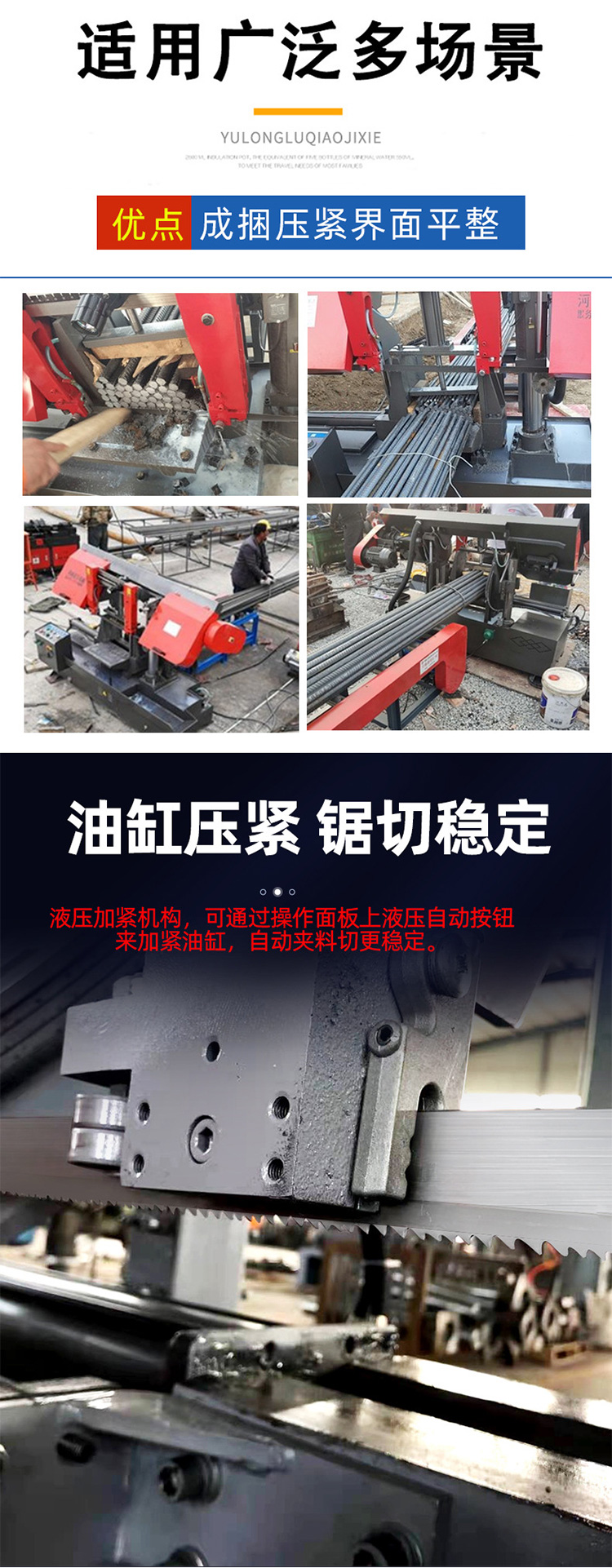 金属切割带锯床 数控液压成捆钢筋带锯床 半自动工字钢水锯床 锯床根据机械分类:般分为种类型圆锯床带锯床锯床,带锯床厂家,这种不类型的锯床般加工不同类型的产品,并且这 大类的产品也着自己再加严密的分类,以便于适应不同的产品,能够切割出加适用的零件和工具。 全自动带锯床在极其特殊情况下,锯床,也可以通过关断配电箱上的总开关停车。液压弯管机主要用于管子的塑性成型 ,日常生活中弯管机可分为数控弯管机,液压弯管机等类型。液压弯管机具有功能多、结构合理、操作简单、方便、安 装快速等优点,用于电力施工,公铁路建设,锅炉、桥梁、船舶、家俱,装潢等方面的管道铺设及修造,液压弯管机除 了具备弯管功能外,还能将油缸作为液压千斤顶使用,相对于数控弯管设备而言具有价格便宜,使用方便的特点,在国 内弯管机市场占据主导产品位置。