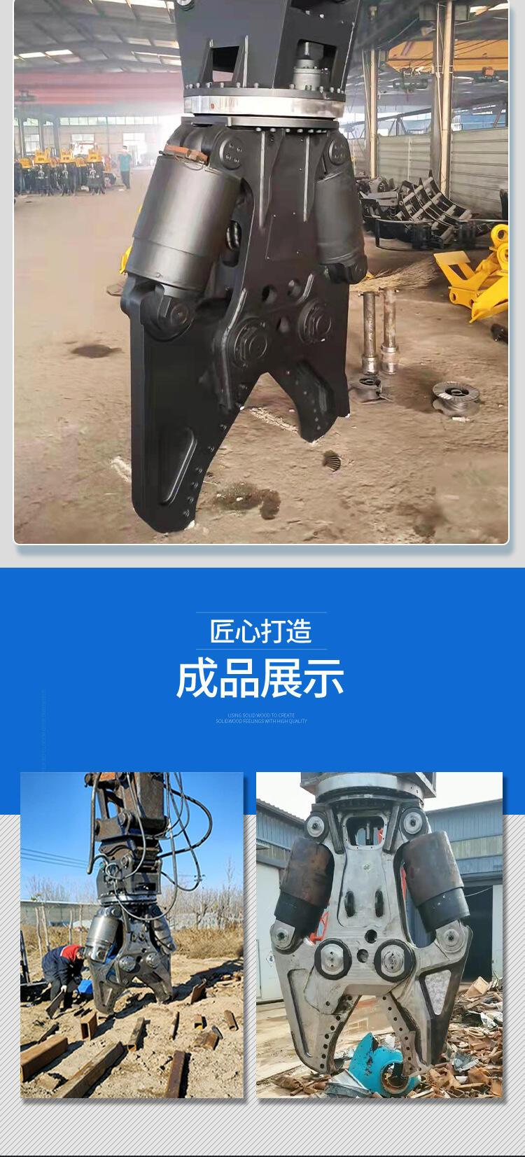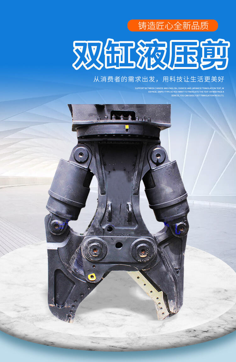 机械式液压剪是挖掘机斗臂油缸作用于连杆摇臂进行伸缩,对上剪刃施以动力,下剪刃固定在斗杆上,即可实现剪切作业,无需使用其它辅助油缸和液压系统。