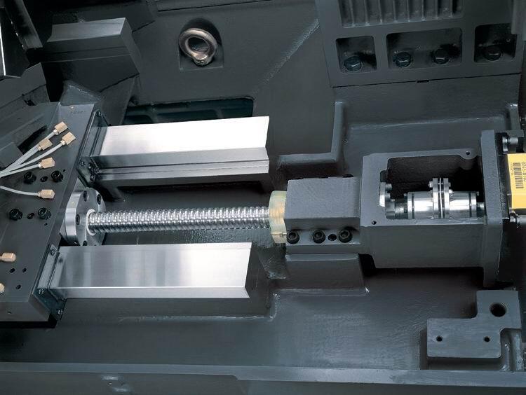 超大尺寸的硬轨与底座、床鞍一体铸造成型,经热处理且精密研磨,并以大跨距设计达成最大的强度与精度。硬轨设计也提供了重切削与断续车削应用的刚性需求。