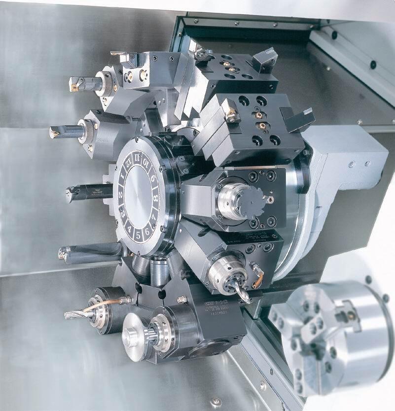 结合动力刀塔,Cf 轴及碟式煞车系统可提供钻、铣、攻牙等复合功能,包括圆柱及极坐标插补之轮廓加工 ( 类同加工中心机第 4 轴旋转台功能 )。