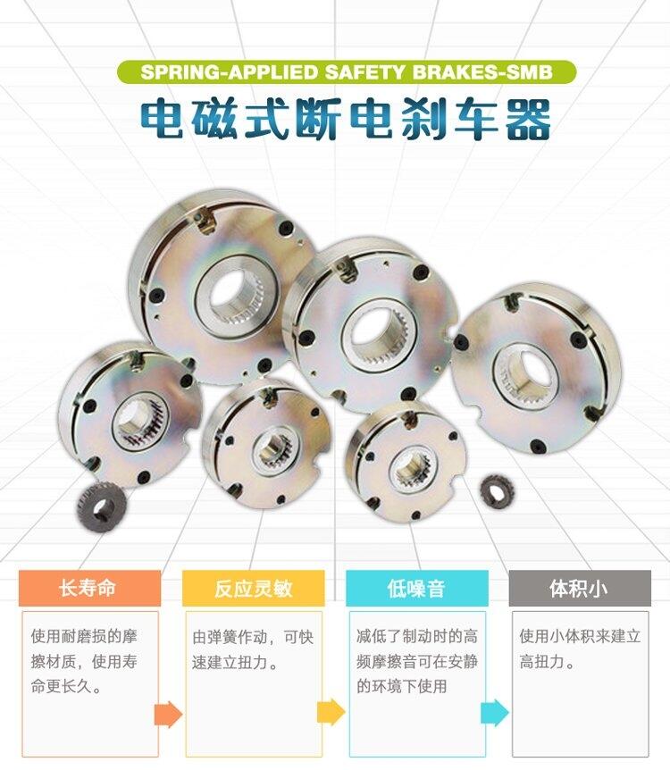 SMB、SBB、SAB及SFB型机械用安全刹车器是使用于当电力突然消失时,用来停止或保持负载。 安全刹车器是利用数条弹簧来供应刹车力,为信赖性非常高的刹车。此种刹车典型应用在机械手臂、Z轴滚珠螺杆、伺服马达及一般电动马达的保持刹车。