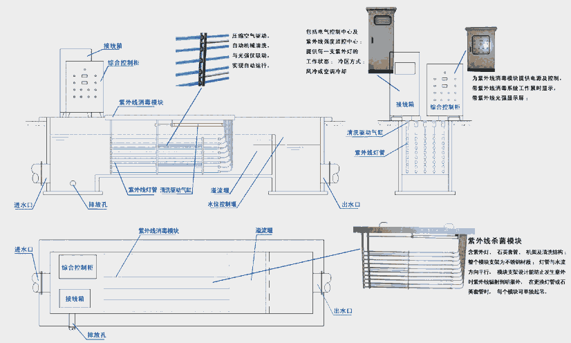 3、本产品可用于替代常规的加氯消毒工艺设备。紫外线消毒模块:放置于水渠内,将灯管全部没于水下作业。