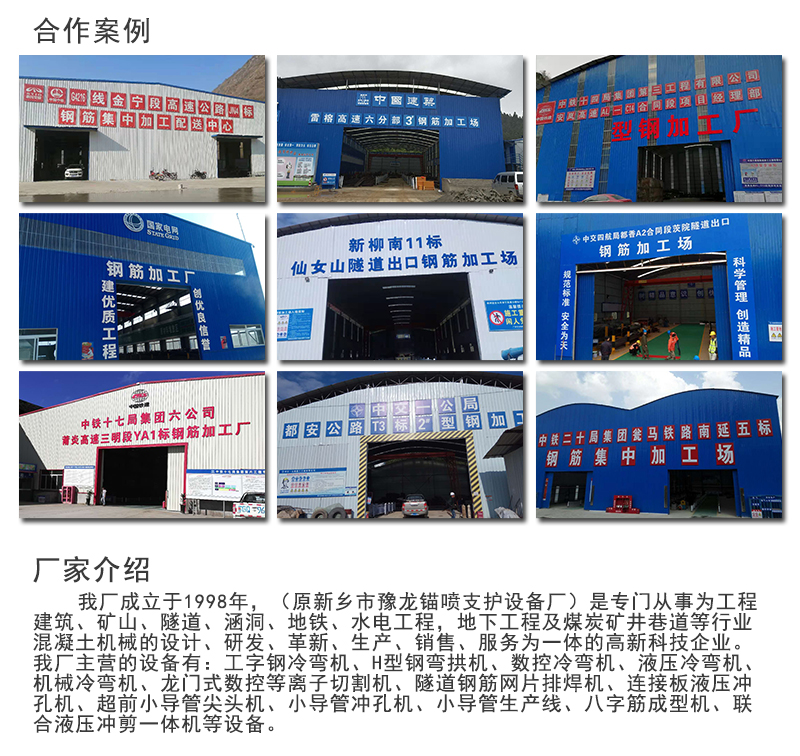我厂生产的钢筋加工场设备有:、连接板冲孔机、小导管尖头机、小导管冲孔机、钢筋网片排焊机、联合液压冲剪一体机、龙门式等离子切割机等设备。