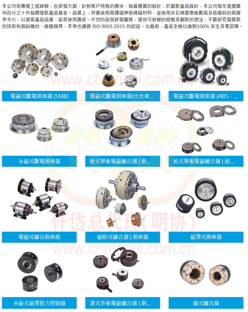 仟岱提供超过1000种以上的离合器及刹车器可供客户选择,产品扭力范围为0.1NM-1000NM,此外也提供为客户量身订制产品的服务,除了本身标准产品的规格外,并且提供具有竞争性的价格。至于品质方面,材质使用高导磁性率低残磁,此外亦使用非石棉摩擦系数高等级低磨耗的来令片,以提高产品品质,延长使用寿命。