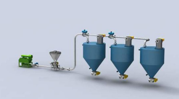 气力输送装置属于密相中压气力输送,适用于不易破碎颗粒、粉料