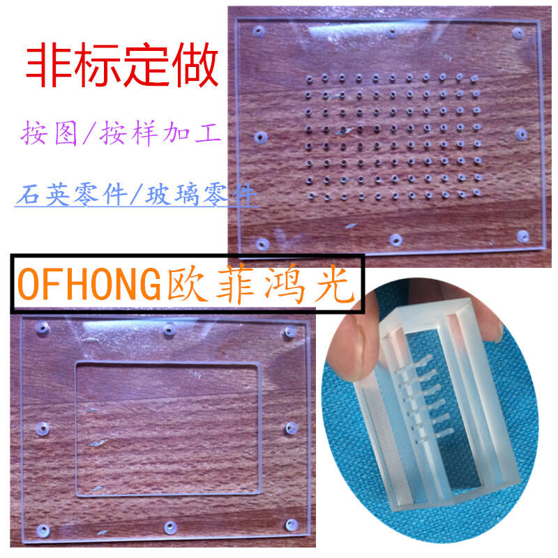 OFHONG微孔石英条打孔石英玻璃螺纹孔石英块钻孔真空吸附平台是一种邦定设备非标定做的零部件,按照客户的图纸或样品加工定制,孔径0.2至600mm之间都可以加工孔径精度0.02mm,