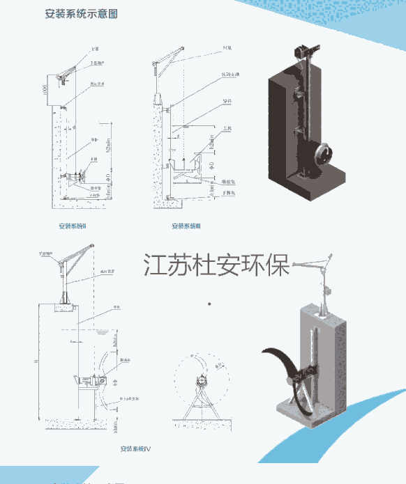 潜水推流器应为成套装置,包括安装系统和提升装置。安装系统应由方钢导杆和顶部部和底部支座等组成,可自由调整推流器的提升和下降,并可在不排空水池的情况下拆卸和安装推流器。推流器装在一个可在导杆上滑动的支架上作为一个整体,该支架必须能够承受推流器的整个重量和造成的所有推力。提升装置应为可移动式,起吊架的固定装置不可安装在池壁上或池测工作平台上,应安装在安装系统的顶部支座上,应含专用起吊钩、提升链和葫芦。每台推流器配备一套起吊架。