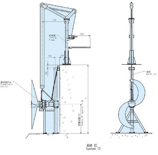提升导杆带有焊接的底座,高度应适合将潜水推流器/搅拌器安全地提升出池面。导杆顶部应配备锁定平台,平台可提供导杆一个特殊的转角。每台潜水推流器/搅拌器应配备便于安装的支架,支架可在180度范围内旋转。