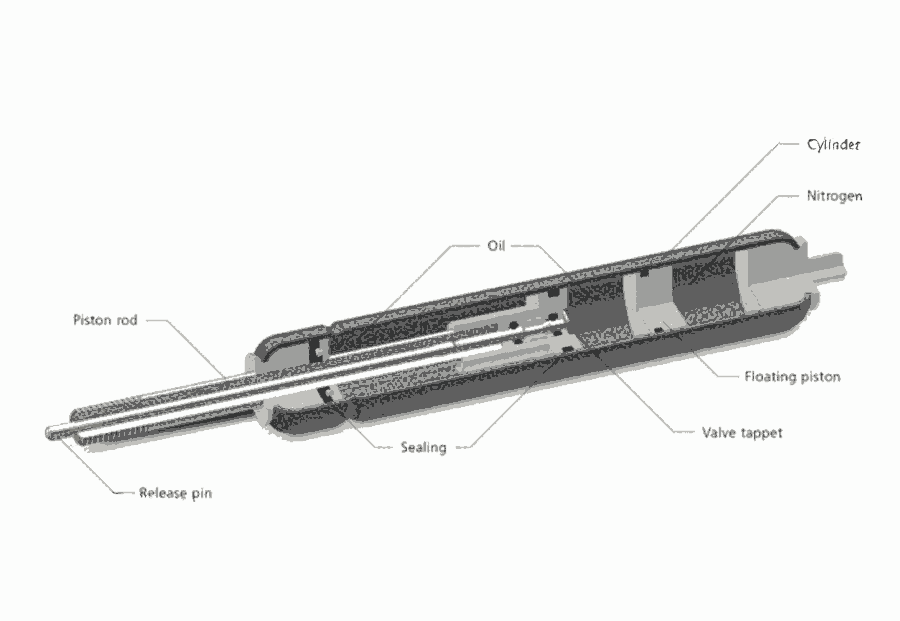 操作释放打开气体支柱的活塞阀。在考虑弹性锁定气弹簧时,流过活塞的是氮气,而在刚性锁定弹簧中,流过活塞的是油。