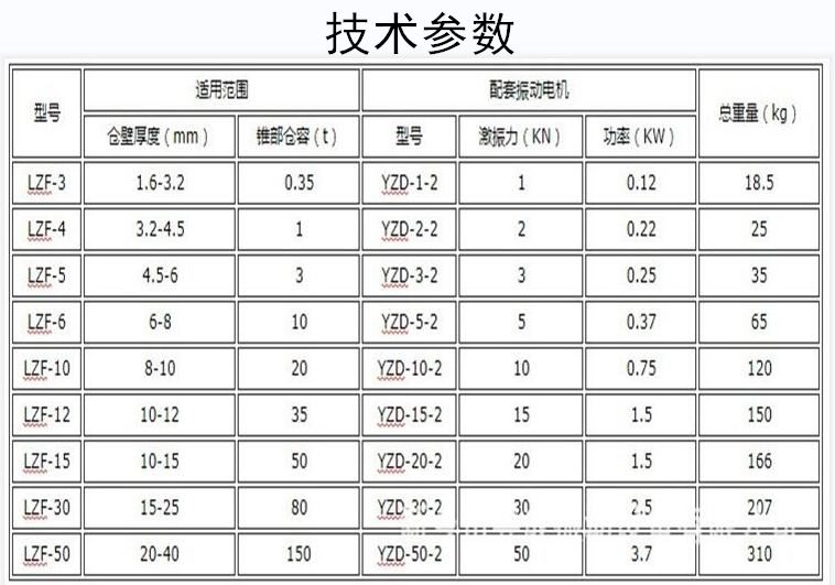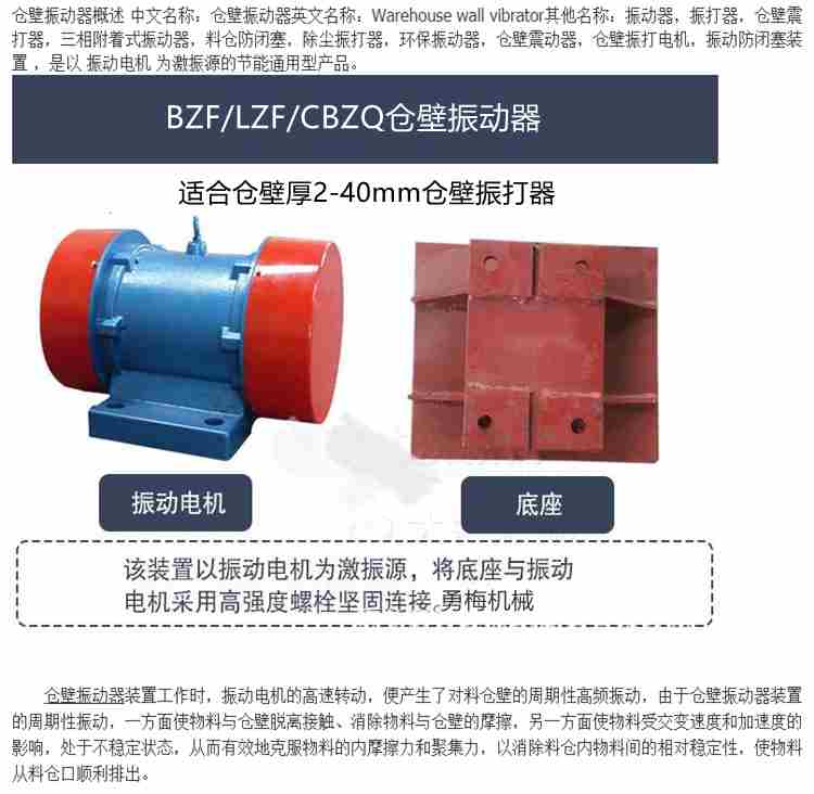 料仓防闭塞装置三相异步振打电机 LZF-6电机仓壁振动器可用于清除各种仓壁、管道粘结物料,还可作为振动给料机、振动输送机、振动漏斗、振动溜槽的振动源等。广泛应用于矿山、冶金、化工、建材、机械等各行各业中。选用时应根据料仓形状及物料特性,选择不同振动力的振动器。如圆锥形料仓因其表面刚度较大,可适当选择振动力偏大的,棱锥形仓料可适当偏小,如单台效果不太好,可选两台或多台组装,或直接将仓壁振动器也称仓壁振打器与料仓内活化器连接,以提高使用效果。仓壁振动器安装位置一般位于料仓锥体高度1/4或小于1/4处。如安装两台以上,可在对称面的不同高度安装,对于木制或混凝土料仓,可在仓壁加装振动板以传递振动力,活化物料。