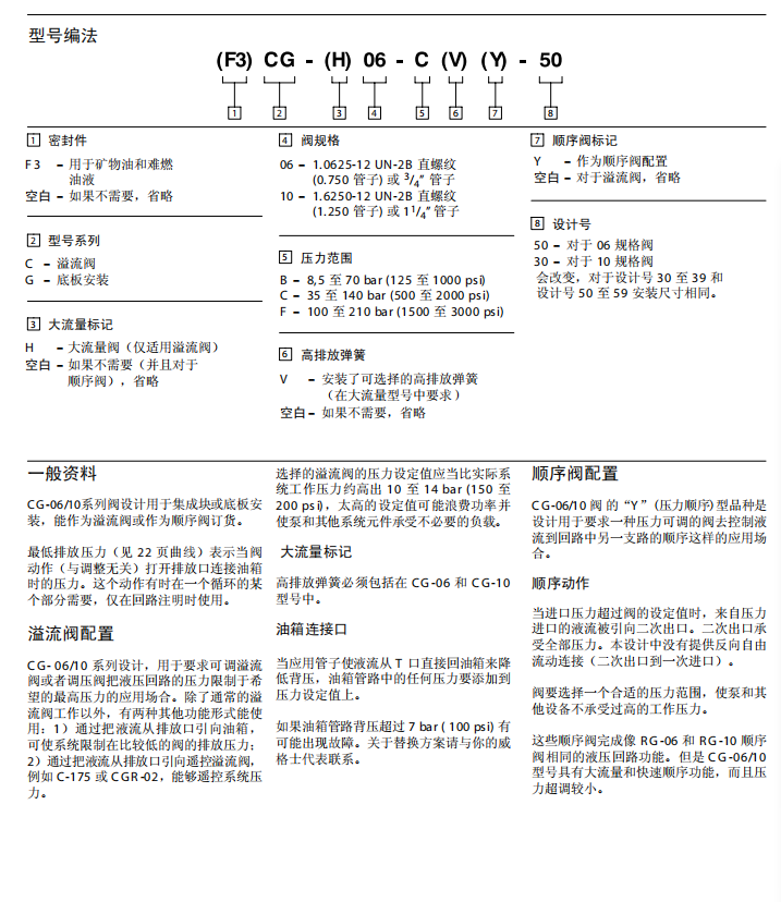 CG-06-CVY-50系列阀设计用于集成块或底板安装,能作为溢流阀或作为顺序阀订货。