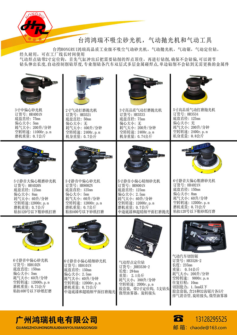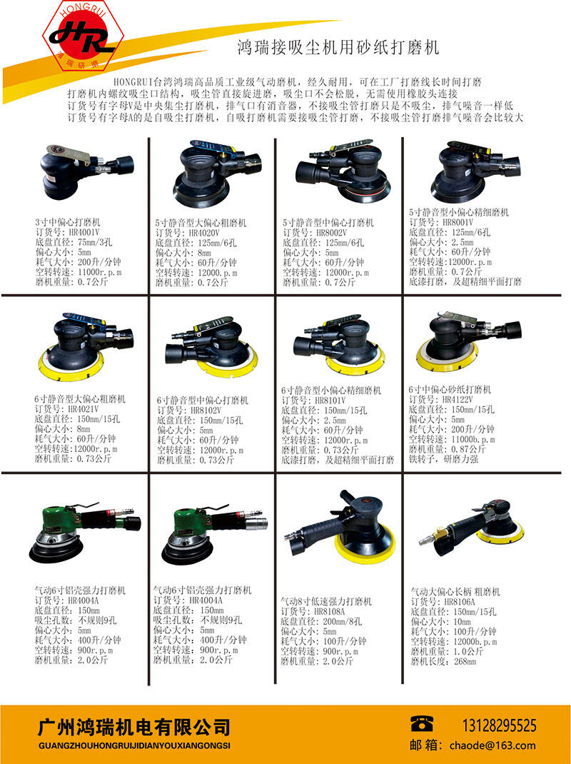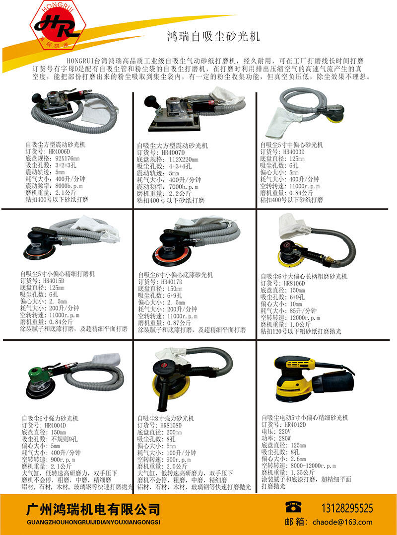 1、自动吸尘款:配自吸尘软管和装粉尘的布袋,在打磨的同时利用磨机排出的压缩空气形成负压,可以吸取部份打磨出来的粉尘到吸尘布袋,吸尘效果不佳。订货号:HR4004D