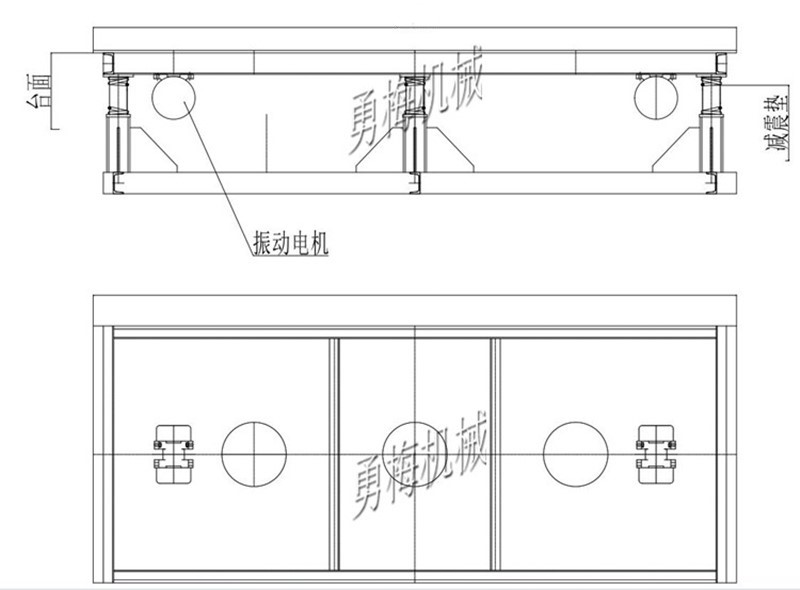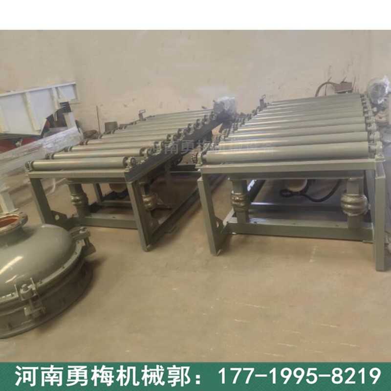砼浇筑输送震实一体托辊振动平台 混凝土平台振捣器托辊组件:是托辊式振动平台的关键部件,通常由多个托辊组成,每个托辊的两端各通过一个托辊支架与基座相连,托辊可在托辊支架上自由转动。这些托辊一般被均分成两组,分别设置在平台支撑结构的两边,其轴向中心线与激振力方向垂直。