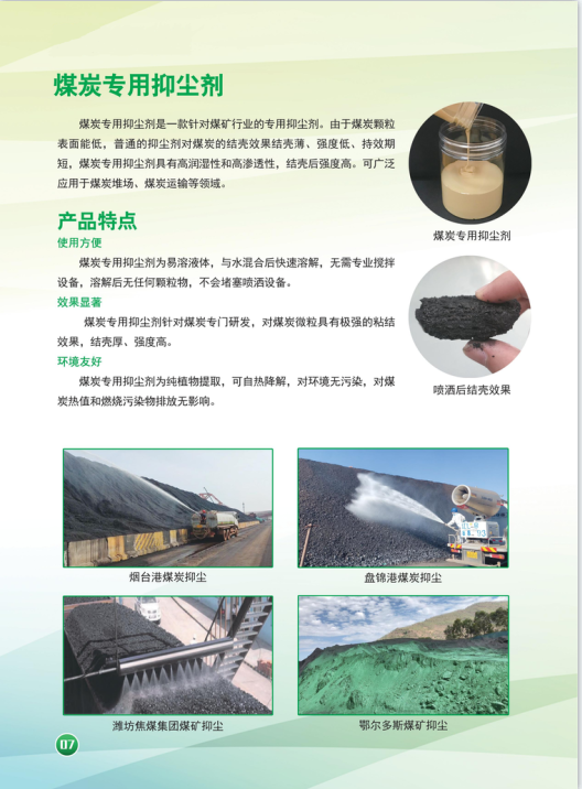 抑尘剂能进行有效抑尘的主要机理——颗粒团聚理论。通过捕捉、吸附、团聚粉尘微粒,将其紧锁于网状结构之内,起到湿润、粘接、凝结、吸湿、防尘、防浸蚀和抗冲刷的作用,再利用抑尘剂良好的成膜特性,有效的固定粉尘并在物料表面形成防护膜,从而防止扬尘的产生。