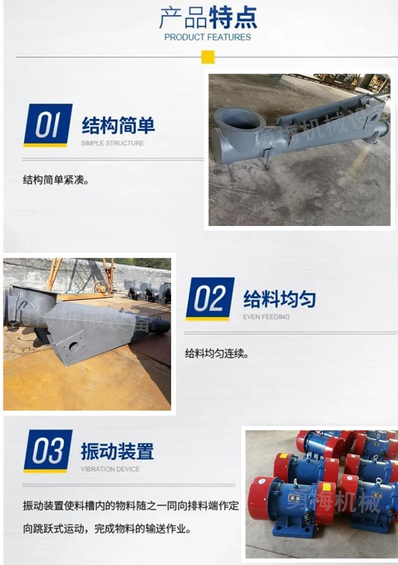 可以多点进料卸料长距离惯性管式震动输送机 是利用激振器产生的振动力,使料管(槽)产生振动,从而使槽内物料沿一定方向滑行或抛移。常见的是依靠固定在料槽上的两台振动电机的自同步运转,使料槽产生直线振动,迫使物料向前运行,达到惯性输送的目的。当振动电机运转时,会产生周期性的激振力,这个力传递到料槽上,使料槽做往复振动,物料在槽内受到振动的作用,克服摩擦力和重力等,以跳跃或滑动的方式向前移动。
