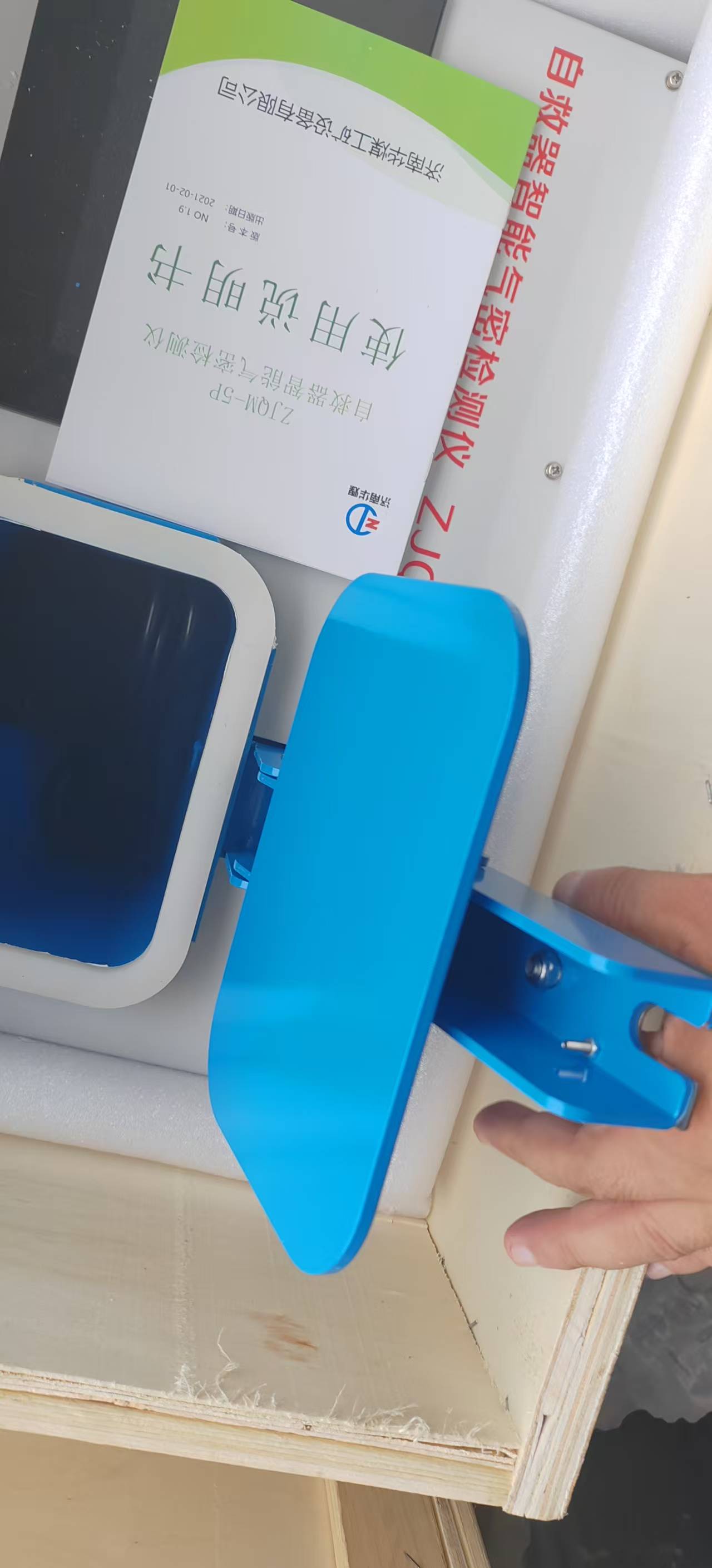2、将被检自救器电子标签二维码对准扫码模块,扫码结果读入显示屏编码栏,自救器放入仪器检测气室内,把手螺栓推入压梁,触摸开始检测按键,仪器自动密封,加压检测,并将检测结果存入设备,同时打印出检测结果,可将检测结果贴在自救器上,方便识别。检测不合格的自救器应予以隔离并另行处理。
