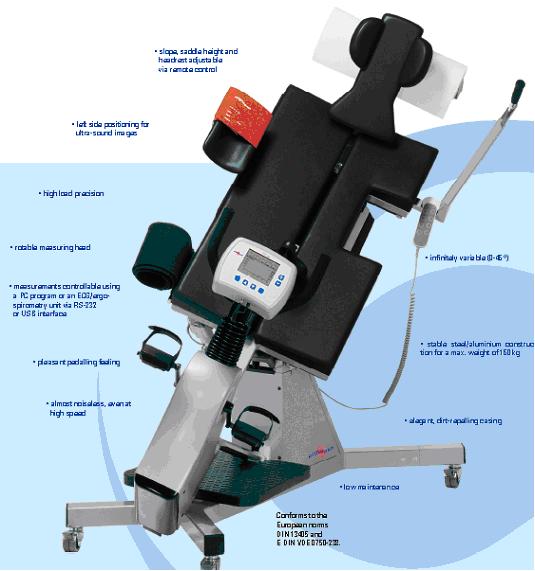 德国Eragosana公司生产的SANA CARDIO 1000(原Sana-cardio-250SE)卧式运动负荷超声踏车/负荷超声运动踏车,床体可右倾45°,是基于卧式负荷超声技术的安全测力计。除了这个特殊的应用外,测力计当然还可以用于正常的卧式安全测力,常用于:在运动负荷过程中优化超声心动图质量、运动营养代谢测试评估、运动员体能状况检测、劳动力鉴定测试、运动训练、康复训练等。