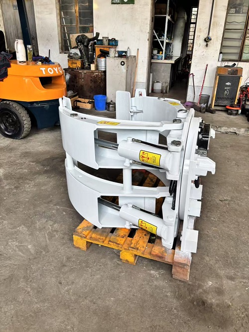 核心特点与工作原理 卡斯卡特圆抱夹的核心特点包括双向360度旋转、弧形夹臂设计以及稳定的液压系统。它通过叉车的液压系统提供动力,操作员控制液压阀,液压油驱动油缸使两个弧形夹臂闭合来夹紧货物。其旋转功能允许夹臂在任意角度进行精准操控,便于堆垛或调整货物姿态。