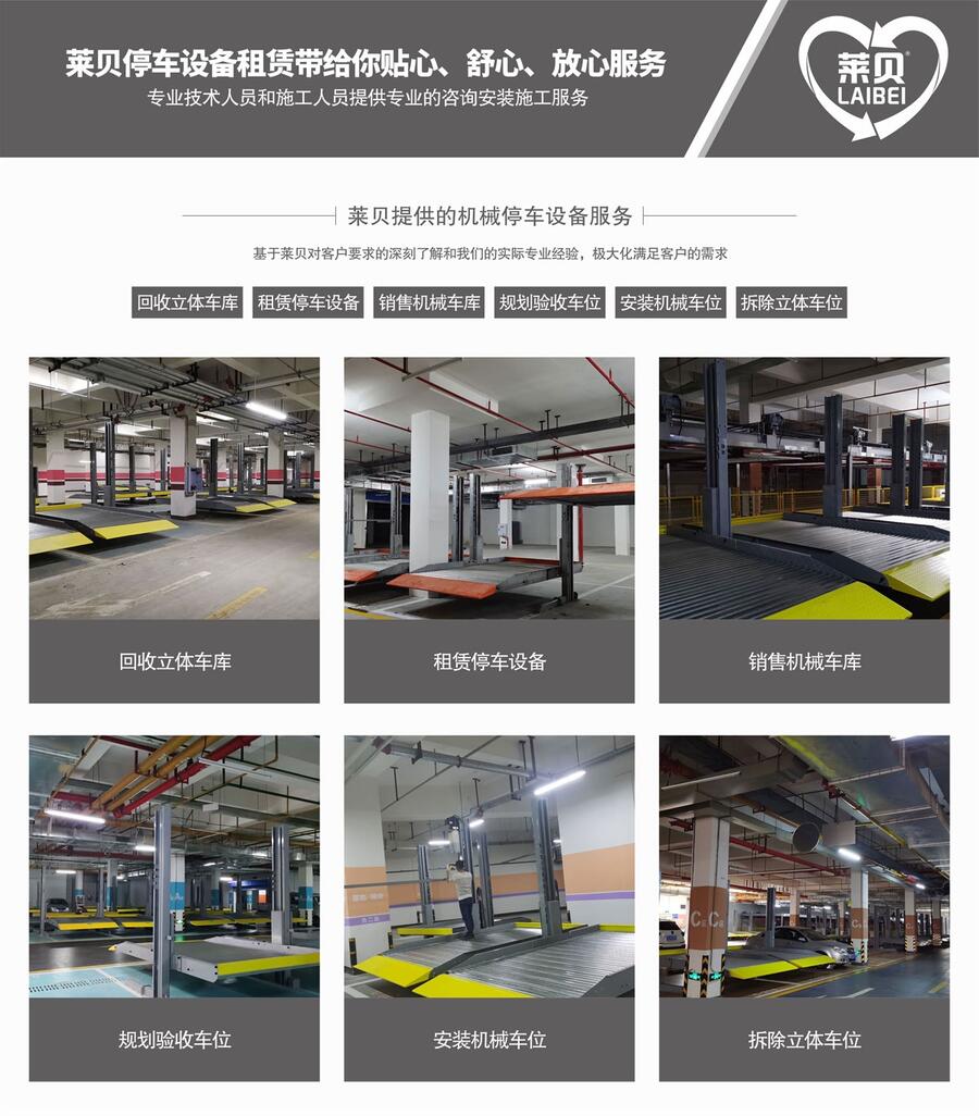 莱贝停车设备主营出租全自动机械式停车设备、垂直立体停车回收、。机械式立体车库行业在汽车保有量急剧加和土地资源日益紧张的矛盾背景下发展。随之,立体车库价格成为大家关注的问题,不少想要买车位或者新建停车场的客户会问,立体停车位多少钱一个?立体车库属于一种设备,其类型多样,一般有简易升降类立体车库、升降横移类、水平循环类、巷道堆垛类等等,每种类型也分很多,比如常见的有二层升降横移立体车库、三层立体车库等,每种的价格也不同。总体来说,立体车库价格影响的因素主要有立体车库生产厂家、立体车库品、立体车库种类、质量、市场竞争状态等。同一个厂家生产的不同类型的立体车库价格不同,同一类型的立体车库价格在市场上也有差别,更关键的是取决于厂家选用的原材料,因为原材料决定了立体车库生产成本。这里小编要提醒您,目前有不少立体车库生产商规模小且不,他们只是看重了立体停车设备的刚姓需求就生产,为节省成本在原材料选择上选用劣质的钢材,销售时故意压格赢取客户,这样的立体车库质量很难过关,所以您在选择时不要只看价格,毕竟立体车库直接关系到您的,俗的便宜没好货并不是道除了比较车库价格,还要看立体车库厂家的、水平、客户等。