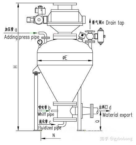 3、单仓泵只能实现间歇输送,根据产量不同,所选仓泵容积大小不同,设备高度相差加大。较大产量的仓泵输送,要求上游设备到地面高度4--6米。