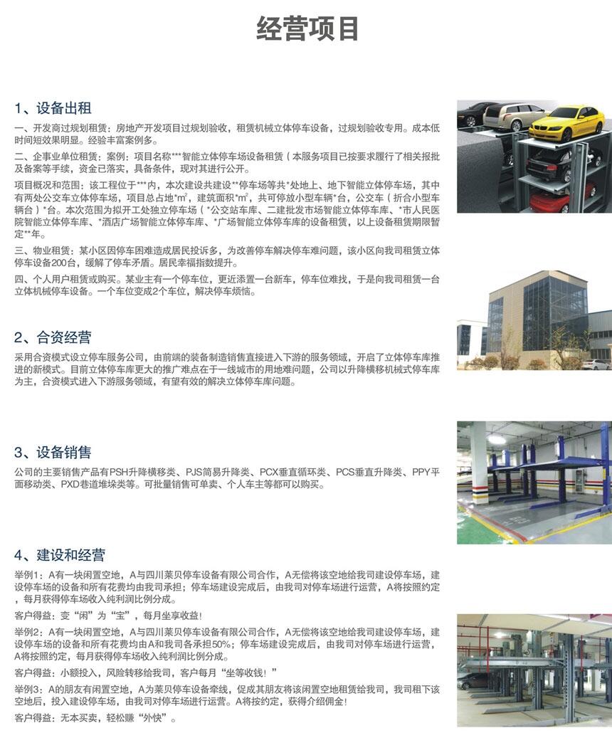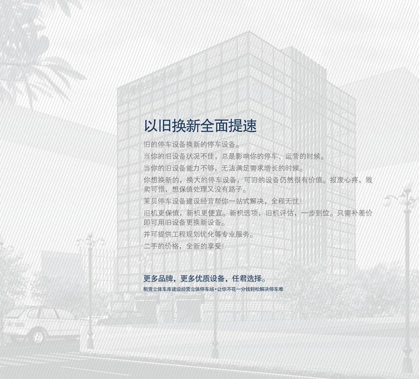 四川莱贝停车设备有限公司致力于四川营山立体车库租赁、收购立体停车设备、莱贝机械停车设备回收、机械停车设备销售、机械式立体车库设备经营租赁、立体停车场建设、停车场经营管理、停车场规划设计、停车场施工建设、共享停车、盘活停车场、收购停车场、租赁停车场、收购停车位、出售停车位、停车资产管理及互联网停车软件开发车主服务等领域。我们为机场、车站、商场、大学、住宅、酒店、P+R停车等各种停车类型,从一个停车场一个区域到一个城市提供的停车位经营解决方案。公司严格按照ISO9001:2015质量管理体系、ISO14001:2015环境管理体系、ISO45001:2018职业健康安全管理体系要求,优化组织架构,规范内控体系,明确部门分工,积极开拓市场。业务特色鲜明,在市场营销、风险控制、业务创新、人力资源管理等方面均衡发展,形成覆盖全国的业务网络,建立了科学的管理模式。公司与多家机构、设备制造商、服务团队、停车管理等多家企业形成战略合作关系,抓住历史机遇,创造奇迹,在尽可能短的时间内,做大做强做牌。通过持续改进,不断设计并优化停车场方案,为客户提供多元化的立体停车场经营以及技术支持服务,致力于成为国内更具创新力的立体停车场经营提供商。为了响应快速发展的停车需求和引入社会资源优化停车产业结构的号召,莱贝停车设备配合政策,改善车主停车体验,解决城市停车难题,将未来停车产业推向新的领域。公司充分利用人才、技术和设备优势,租赁一系列适合国情的、高的产品。主要有:四川营山立体车库租赁、收购立体停车设备、莱贝机械停车设备回收、简易升降式、升降横移升降式等。该产品具有占地面积少、空间利用率高、安装方便、能耗低、噪音小等特点,适用于各种场地和建设要求。公司为客户提供立体车库规划计划、施工设计、安装调试、运营培训、技术支持售后、机械停车设备销售、租赁、回收等多项服务,直至客户满意。