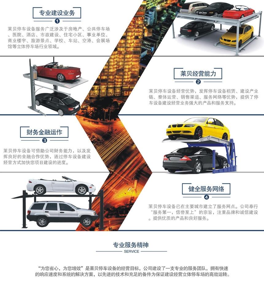 四川莱贝停车设备有限公司致力于贵州贞丰立体车库租赁、立体停车场装修效果、莱贝立体车库租赁、机械停车设备销售、机械式立体车库设备经营租赁、立体停车场建设、停车场经营管理、停车场规划设计、停车场施工建设、共享停车、盘活停车场、收购停车场、租赁停车场、收购停车位、出售停车位、停车资产管理及互联网停车软件开发车主服务等领域。我们为机场、车站、商场、大学、住宅、酒店、P+R停车等各种停车类型,从一个停车场一个区域到一个城市提供的停车位经营解决方案。公司严格按照ISO9001:2015质量管理体系、ISO14001:2015环境管理体系、ISO45001:2018职业健康安全管理体系要求,优化组织架构,规范内控体系,明确部门分工,积极开拓市场。业务特色鲜明,在市场营销、风险控制、业务创新、人力资源管理等方面均衡发展,形成覆盖全国的业务网络,建立了科学的管理模式。公司与多家机构、设备制造商、服务团队、停车管理等多家企业形成战略合作关系,抓住历史机遇,创造奇迹,在尽可能短的时间内,做大做强做牌。通过持续改进,不断设计并优化停车场方案,为客户提供多元化的立体停车场经营以及技术支持服务,致力于成为国内更具创新力的立体停车场经营提供商。为了响应快速发展的停车需求和引入社会资源优化停车产业结构的号召,莱贝停车设备配合政策,改善车主停车体验,解决城市停车难题,将未来停车产业推向新的领域。公司充分利用人才、技术和设备优势,租赁一系列适合国情的、高的产品。主要有:贵州贞丰立体车库租赁、立体停车场装修效果、莱贝立体车库租赁、简易升降式、升降横移升降式等。该产品具有占地面积少、空间利用率高、安装方便、能耗低、噪音小等特点,适用于各种场地和建设要求。公司为客户提供立体车库规划计划、施工设计、安装调试、运营培训、技术支持售后、机械停车设备销售、租赁、回收等多项服务,直至客户满意。