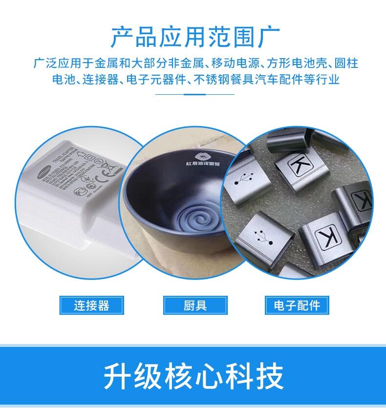 广泛应用于金属和大部分非金属。移动电源,方形电池壳,圆柱电池,连接器,手机外壳,平板电脑,戒指手镯,眼镜,卫浴洁具,小家电,电子元器件,手机键盘按键,不锈钢餐具,汽车配件,dian zi yan等行业