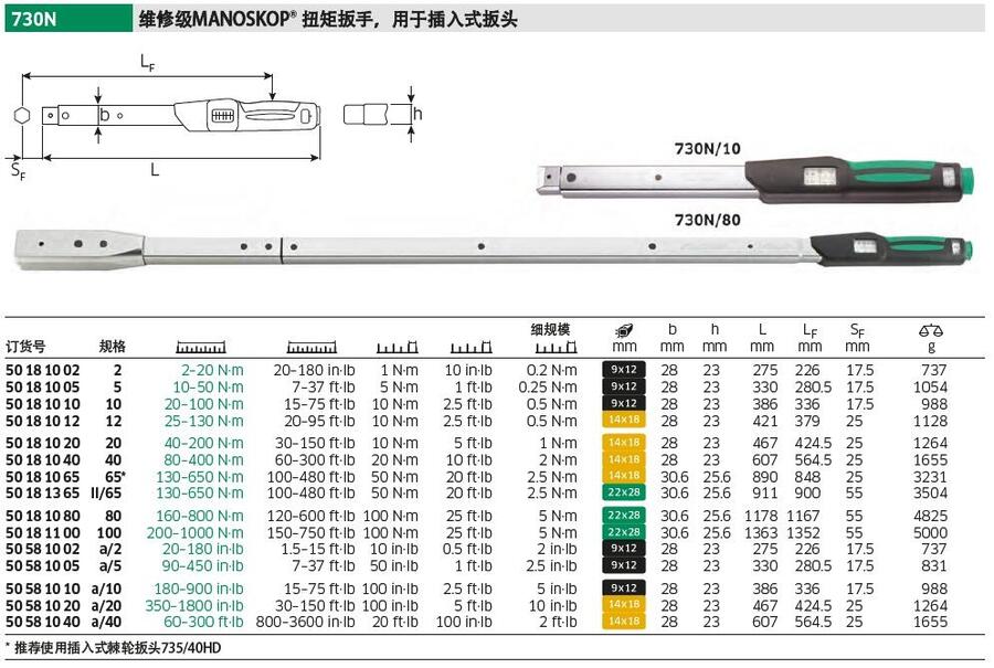 6 清晰的带有颜色的N·m/ft·lb 和 ft·lb/in·lb标记的双刻度尺。