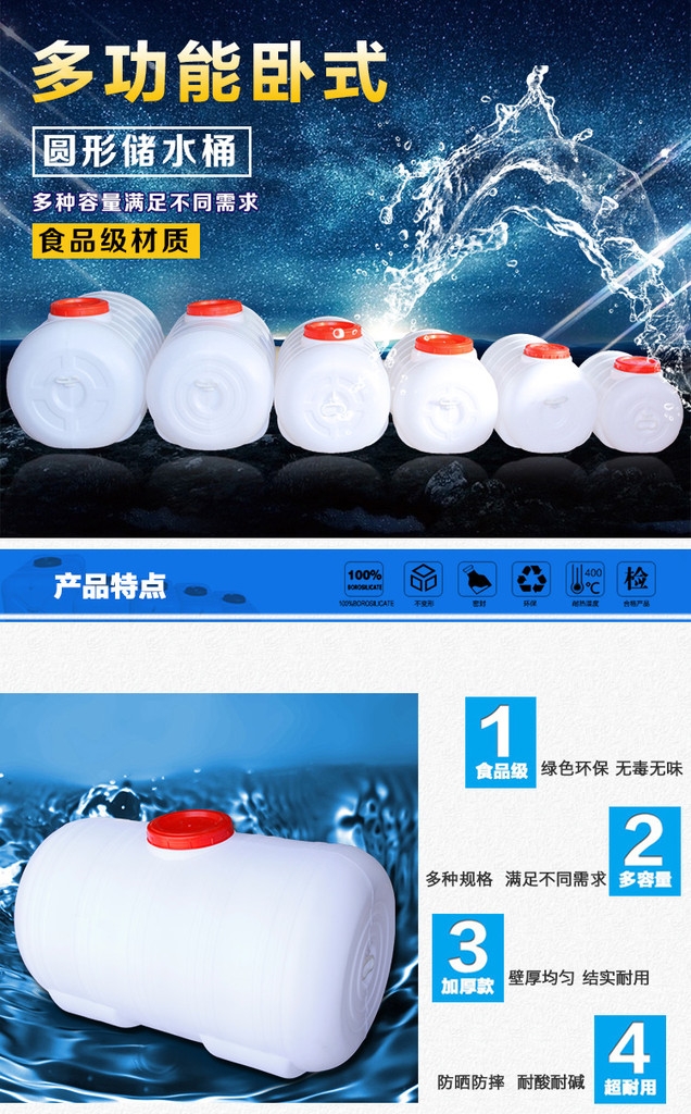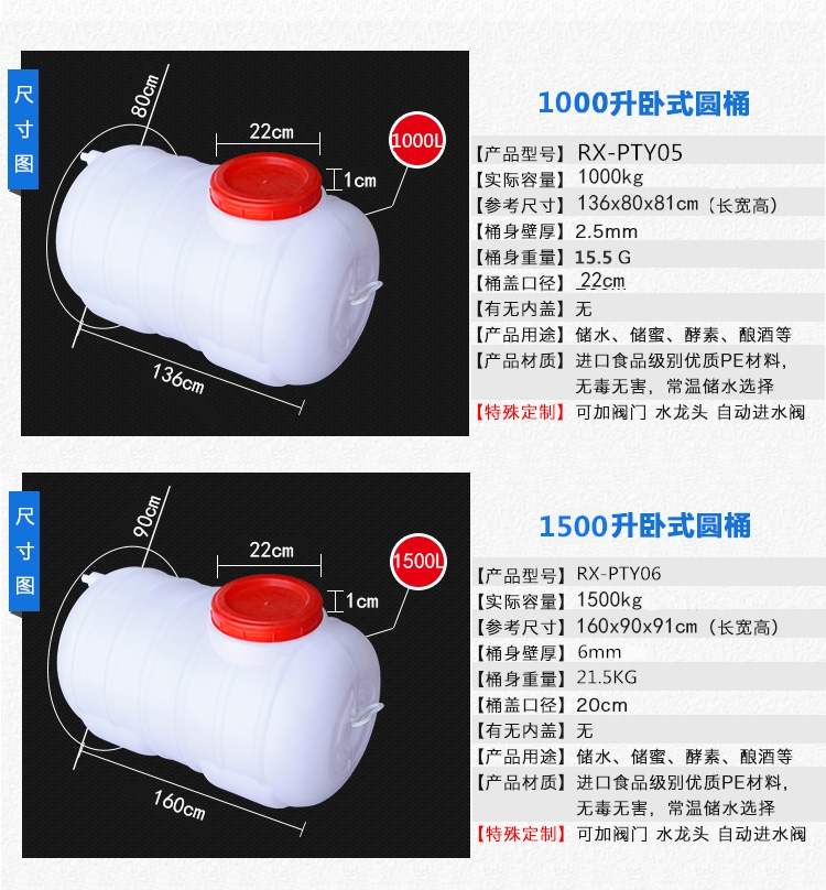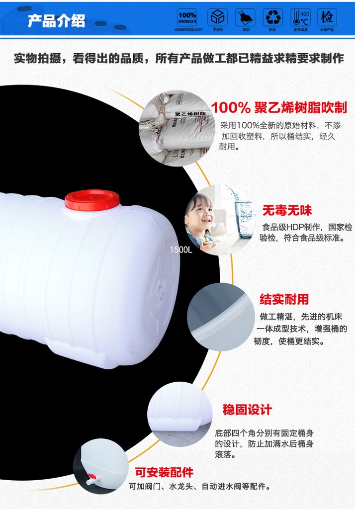 民用卧式塑料桶:1、100%聚乙烯树脂吹制,全新的原始原料,不添加回收塑料,所以桶结实,经久耐用。