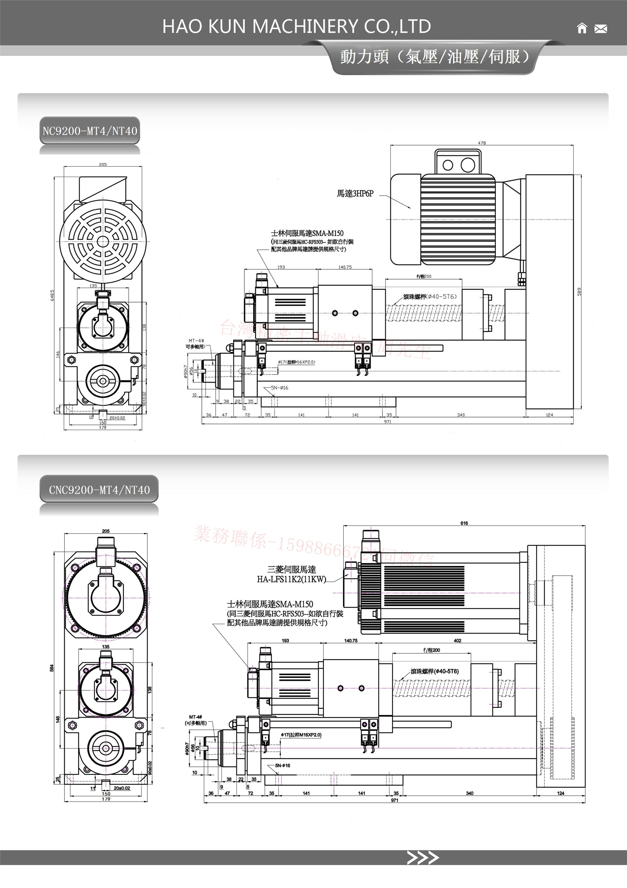 特此说明:以上CNC伺服动力头(可钻孔和攻牙),可将主轴伺服马达改为AC马达成为NC伺服钻孔动力头(NC型号没有攻牙能力),需多孔加工可配多轴器。