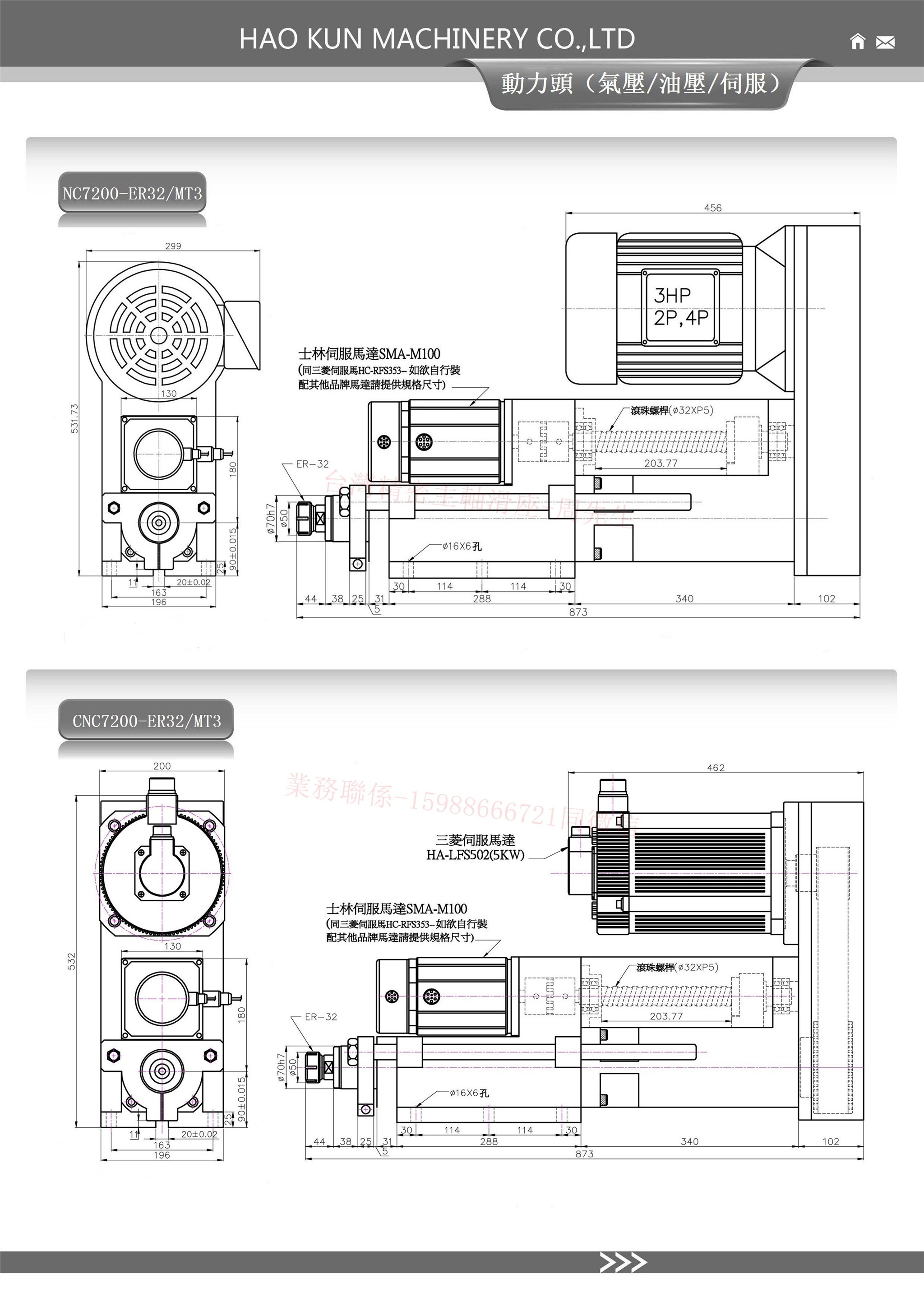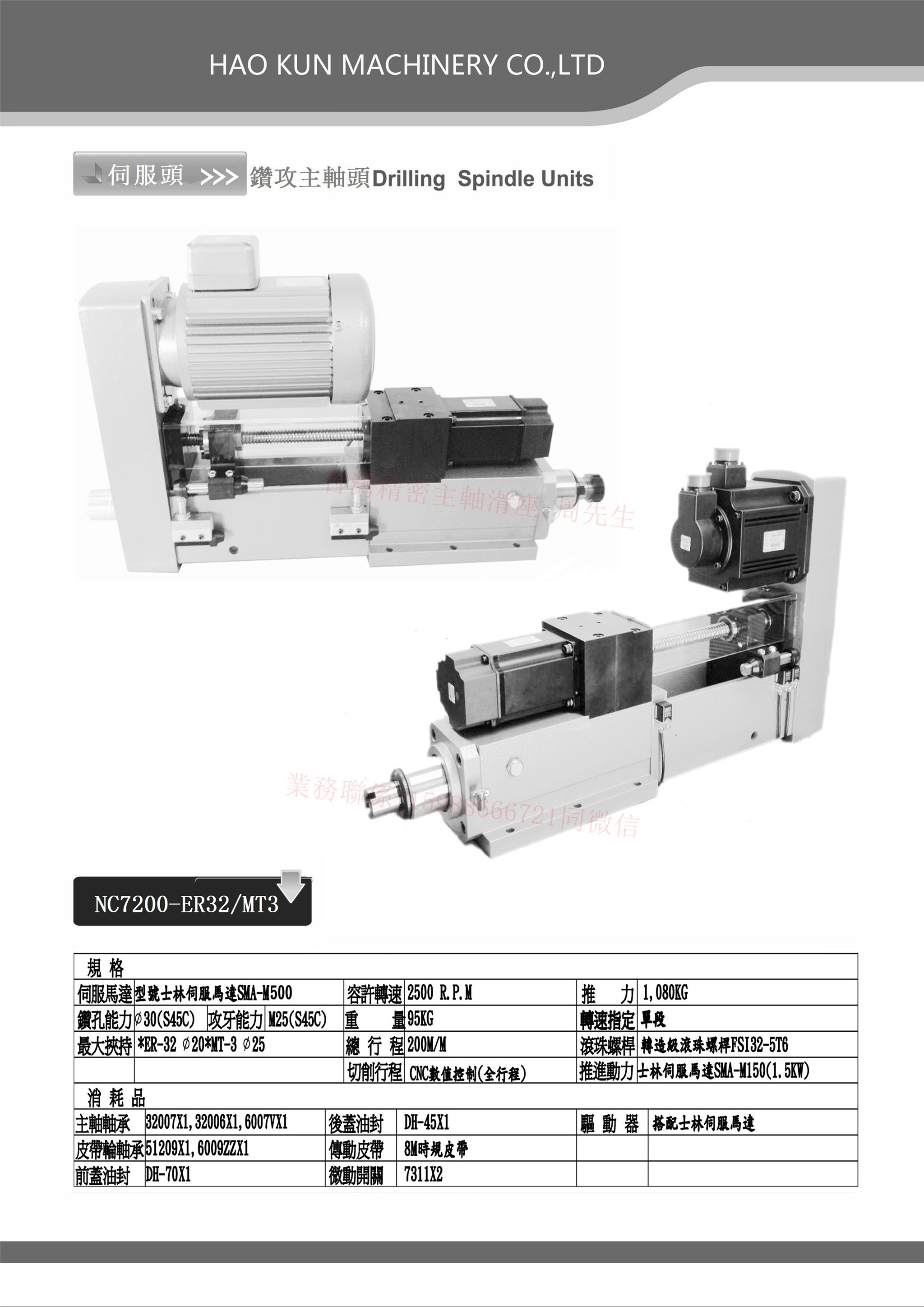 特此说明:以上CNC伺服动力头(可钻孔和攻牙),可将主轴伺服马达改为AC马达成为NC伺服钻孔动力头(NC型号没有攻牙能力),需多孔加工可配多轴器。