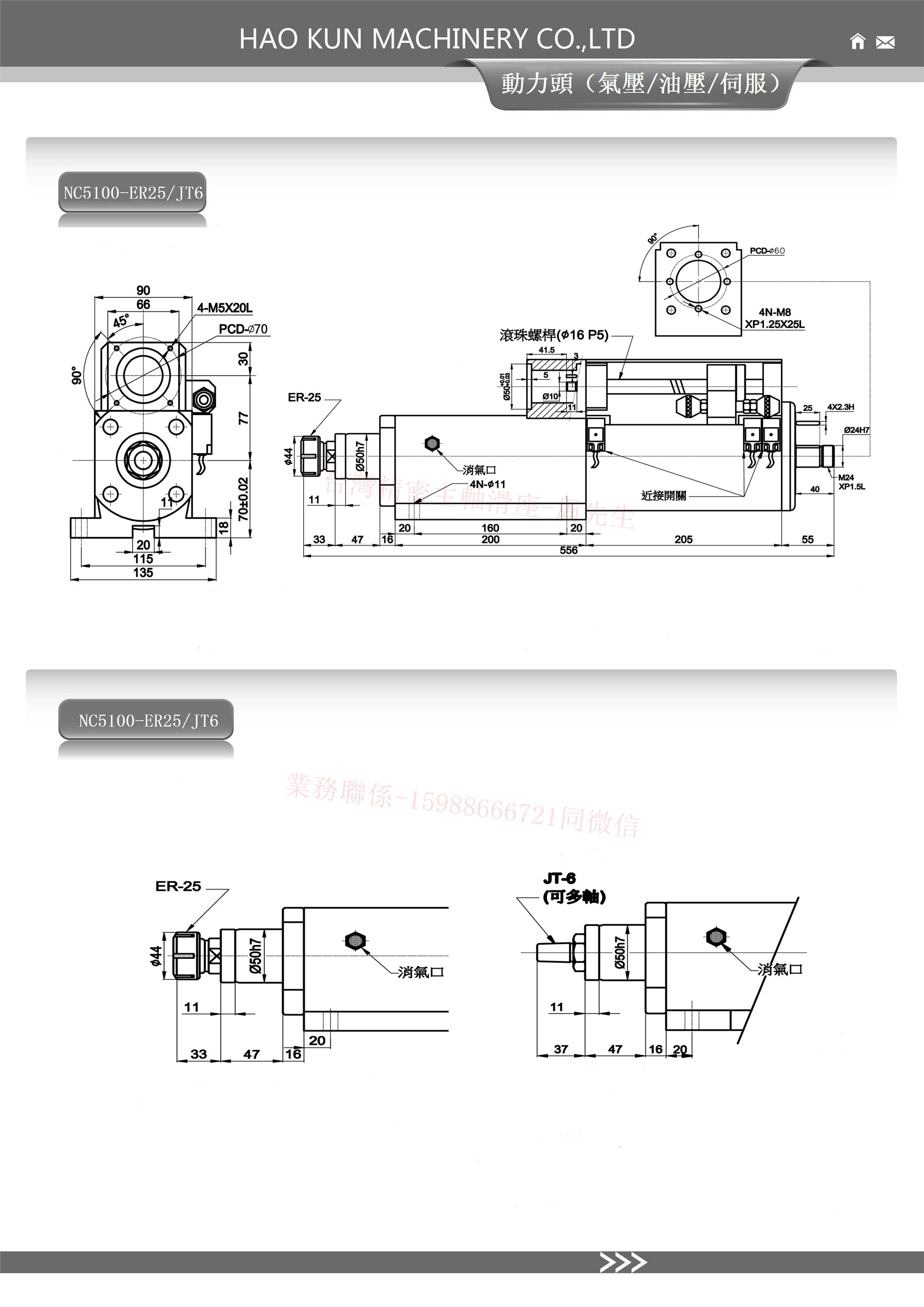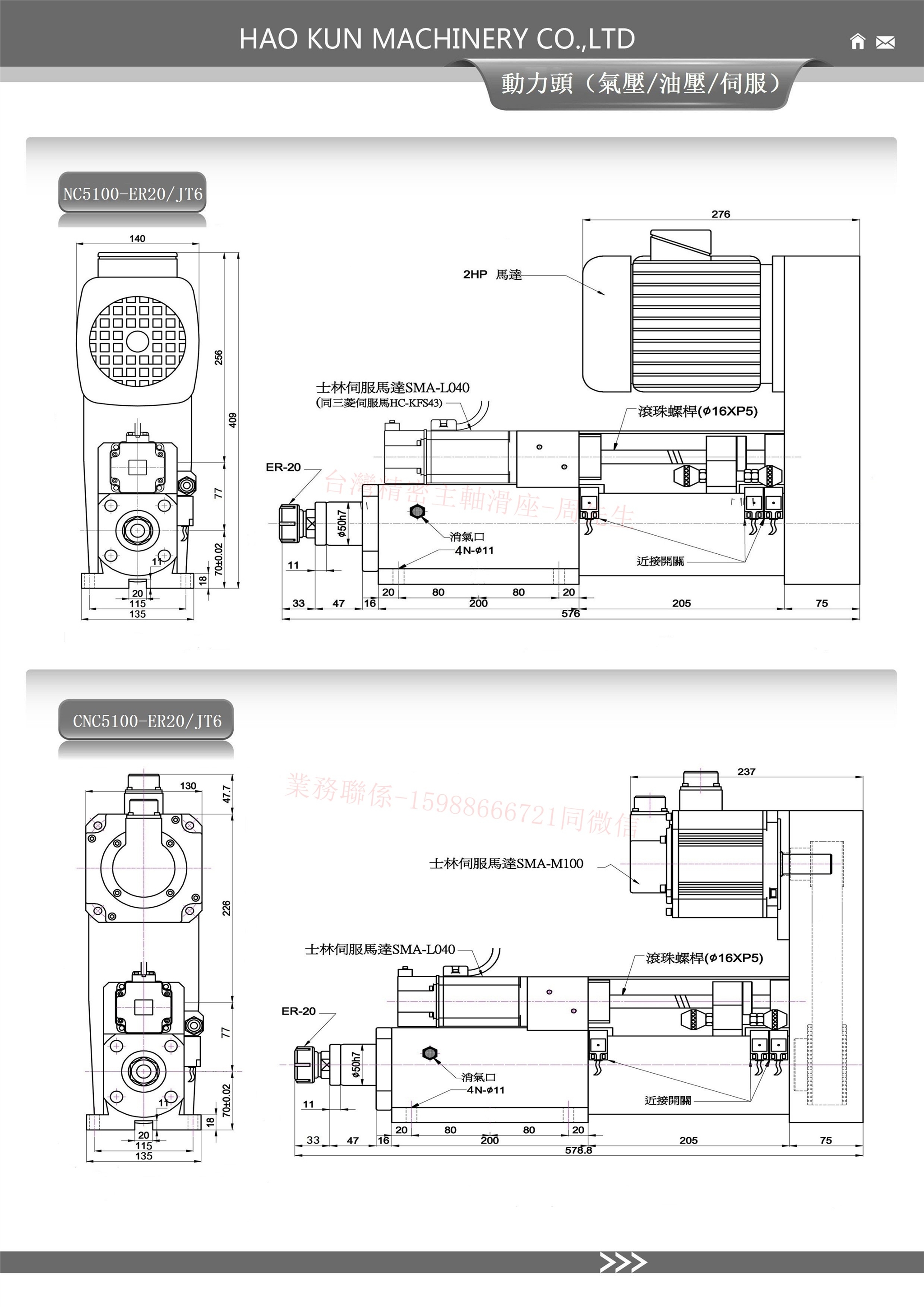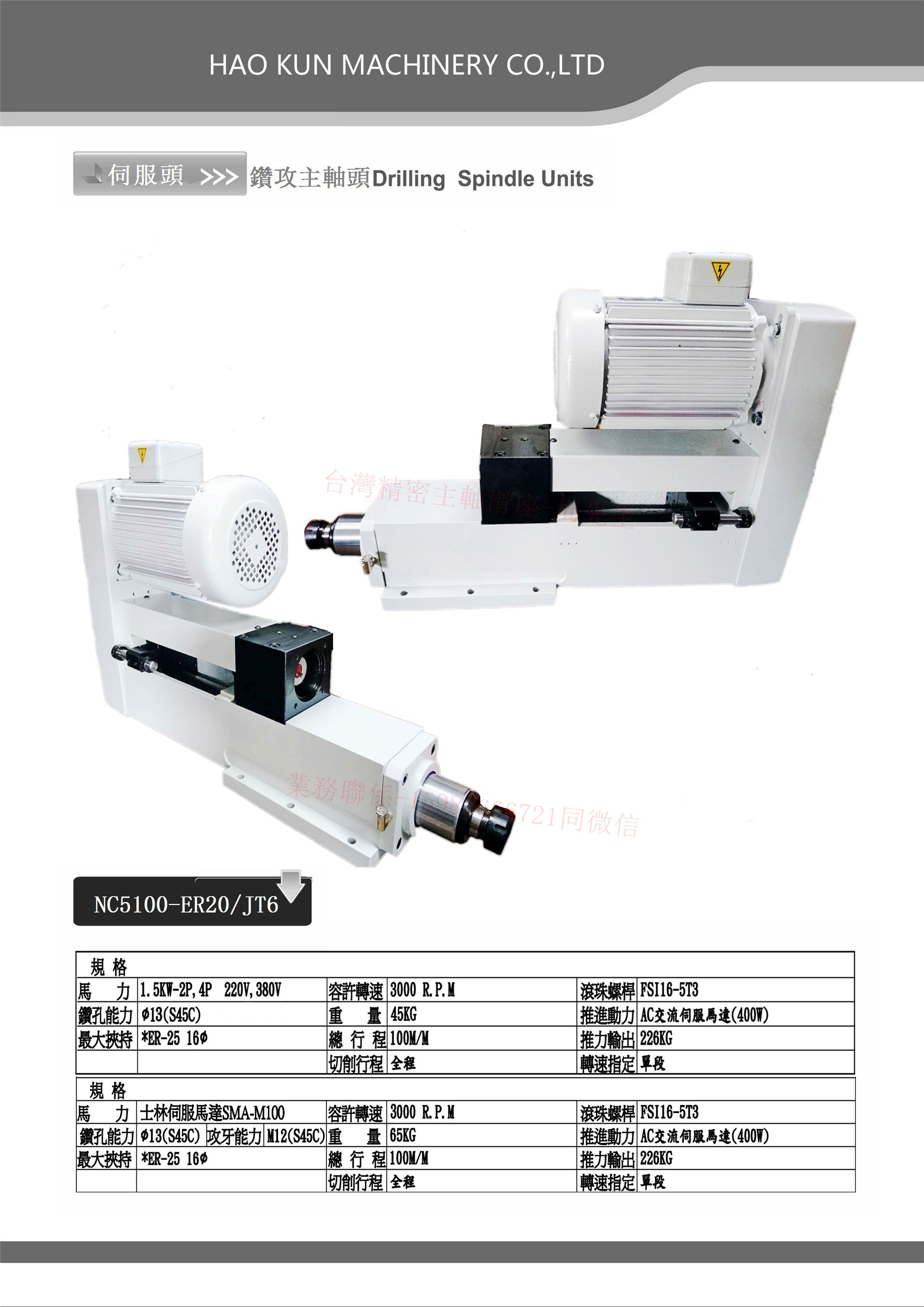 特此说明:以上CNC伺服动力头(可钻孔和攻牙),可将主轴伺服马达改为AC马达成为NC伺服钻孔动力头(NC型号没有攻牙能力),需多孔加工可配多轴器。